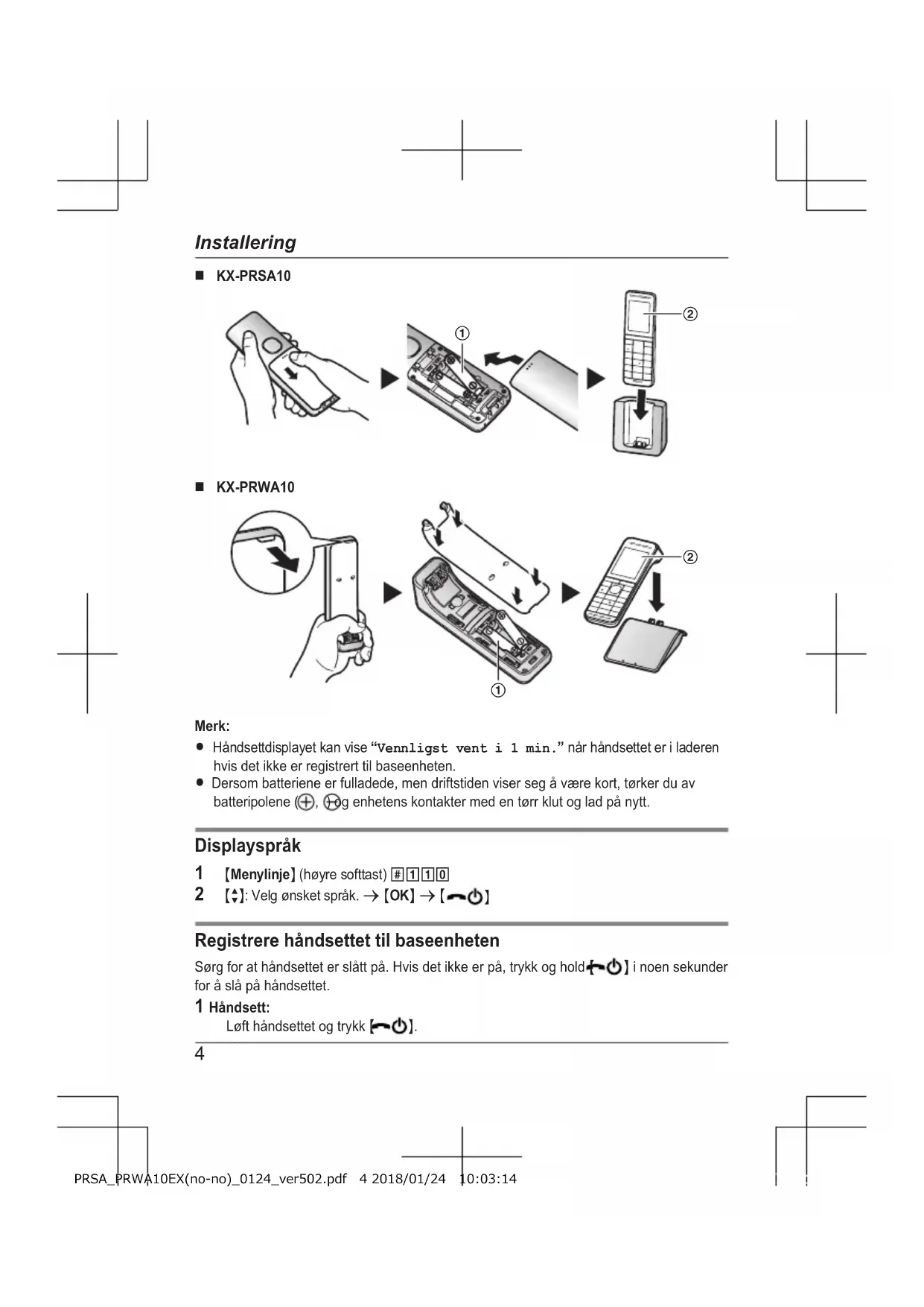 Installation PRSA_PRWA10EX(sv-sv)_0123_ver502.pdf 8 2018/01/23 17:01:01Installasjonsveiledning Ekstra digitalt, trådløst håndsett Modellnr. KX-PRSA10EX KX-PRWA10EX KX-PRSA10 KX-PRWA10 Takk for at kjøpte et produkt fra Panasonic! Denne enheten er et tilleggshåndsett som er kompatibelt med følgende serier av trådløse, digitale telefoner fra Panasonic: - KX-PRS110/KX-PRS120 (KX-PRSA10) - KX-PRW110/KX-PRW120 (KX-PRWA10) (De korresponderende modellene kan endres uten forvarsel.) Du må registrere håndsettet med baseenheten før bruk. Denne installasjonsveiledningen beskriver kun de nødvendige trinnene for å registrere og bruke håndsettet. Les baseenhetens bruksanvisning for nærmere informasjon. Les denne installasjonsveiledningen før du tar i bruk enheten, og ta vare på den for fremtidig referanse. PRSA_PRWA10EX(no-no)_0124_ver502.pdf 1 2018/01/24 10:03:13Informasjon om tilbehør Medfølgende tilbehør Tilbehør/delenummer Antall Lader 1 AC-adapter/PNLV233CE 1 Oppladbare batterier