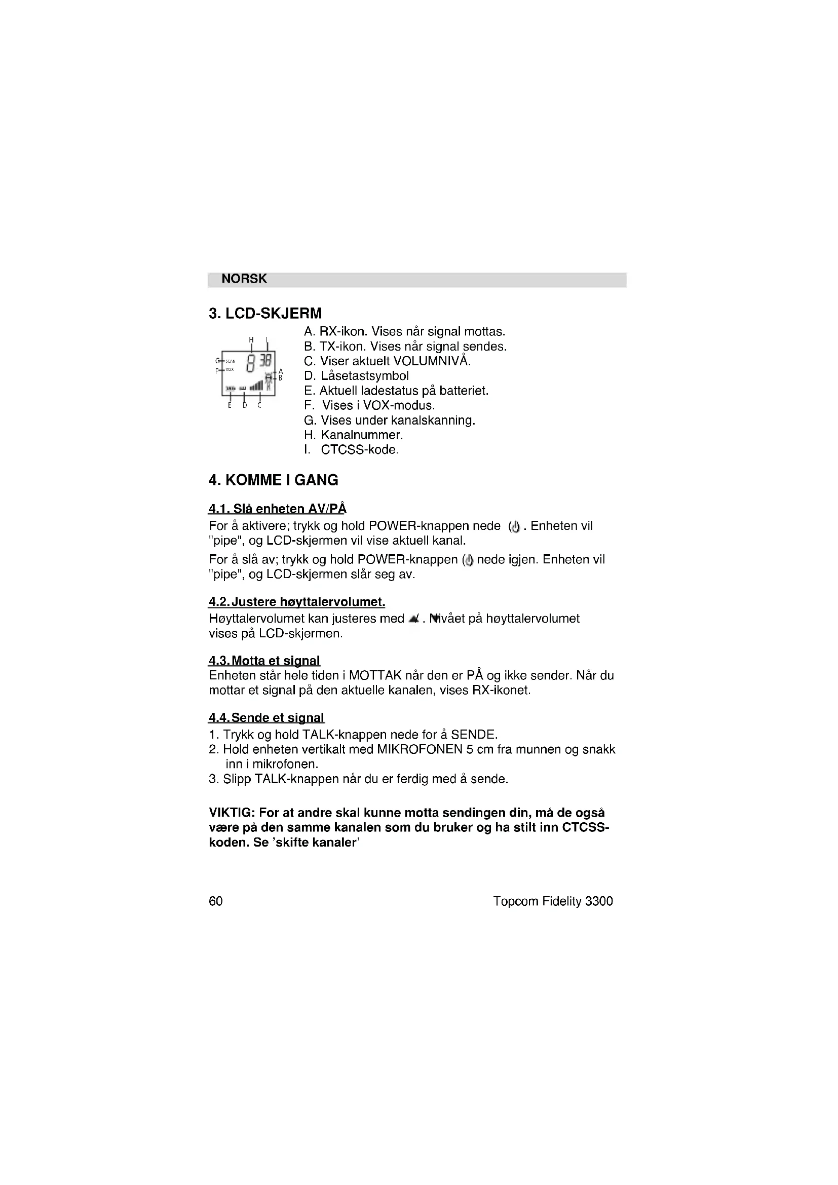 4.1. Slå enheten AV/PÅ For å aktivere; trykk og hold POWER-knappen nede ( ) . Enheten vil "pipe", og LCD-skjermen vil vise aktuell kanal. For å slå av; trykk og hold POWER-knappen ( ) nede igjen. Enheten vil "pipe", og LCD-skjermen slår seg av.