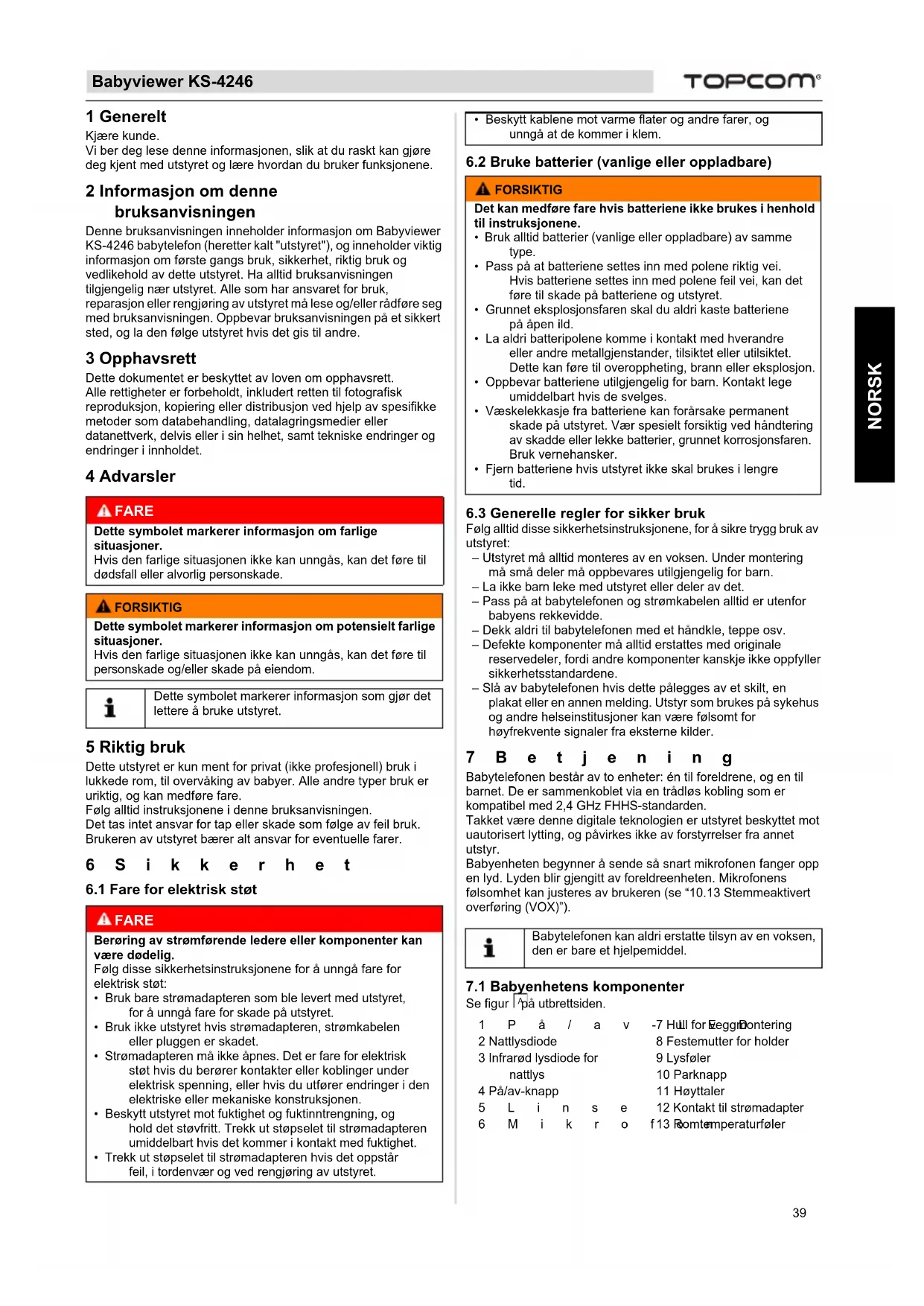 NORSK 1 Generelt Kjære kunde. Vi ber deg lese denne informasjonen, slik at du raskt kan gjøre deg kjent med utstyret og lære hvordan du bruker funksjonene. 2 Informasjon om denne bruksanvisningen Denne bruksanvisningen inneholder informasjon om Babyviewer KS-4246 babytelefon (heretter kalt "utstyret"), og inneholder viktig informasjon om første gangs bruk, sikkerhet, riktig bruk og vedlikehold av dette utstyret. Ha alltid bruksanvisningen tilgjengelig nær utstyret. Alle som har ansvaret for bruk, reparasjon eller rengjøring av utstyret må lese og/eller rådføre seg med bruksanvisningen. Oppbevar bruksanvisningen på et sikkert sted, og la den følge utstyret hvis det gis til andre. 3 Opphavsrett Dette dokumentet er beskyttet av loven om opphavsrett.Alle rettigheter er forbeholdt, inkludert retten til fotografisk reproduksjon, kopiering eller distribusjon ved hjelp av spesifikke metoder som databehandling, datalagringsmedier eller datanettverk, delvis eller i sin helhet, samt tekniske endringer og endringer i innholdet. 4 Advarsler 5 Riktig bruk Dette utstyret er kun ment for privat (ikke profesjonell) bruk i lukkede rom, til overvåking av babyer. Alle andre typer bruk er uriktig, og kan medføre fare.Følg alltid instruksjonene i denne bruksanvisningen.Det tas intet ansvar for tap eller skade som følge av feil bruk.Brukeren av utstyret bærer alt ansvar for eventuelle farer. 6Sikkerhet