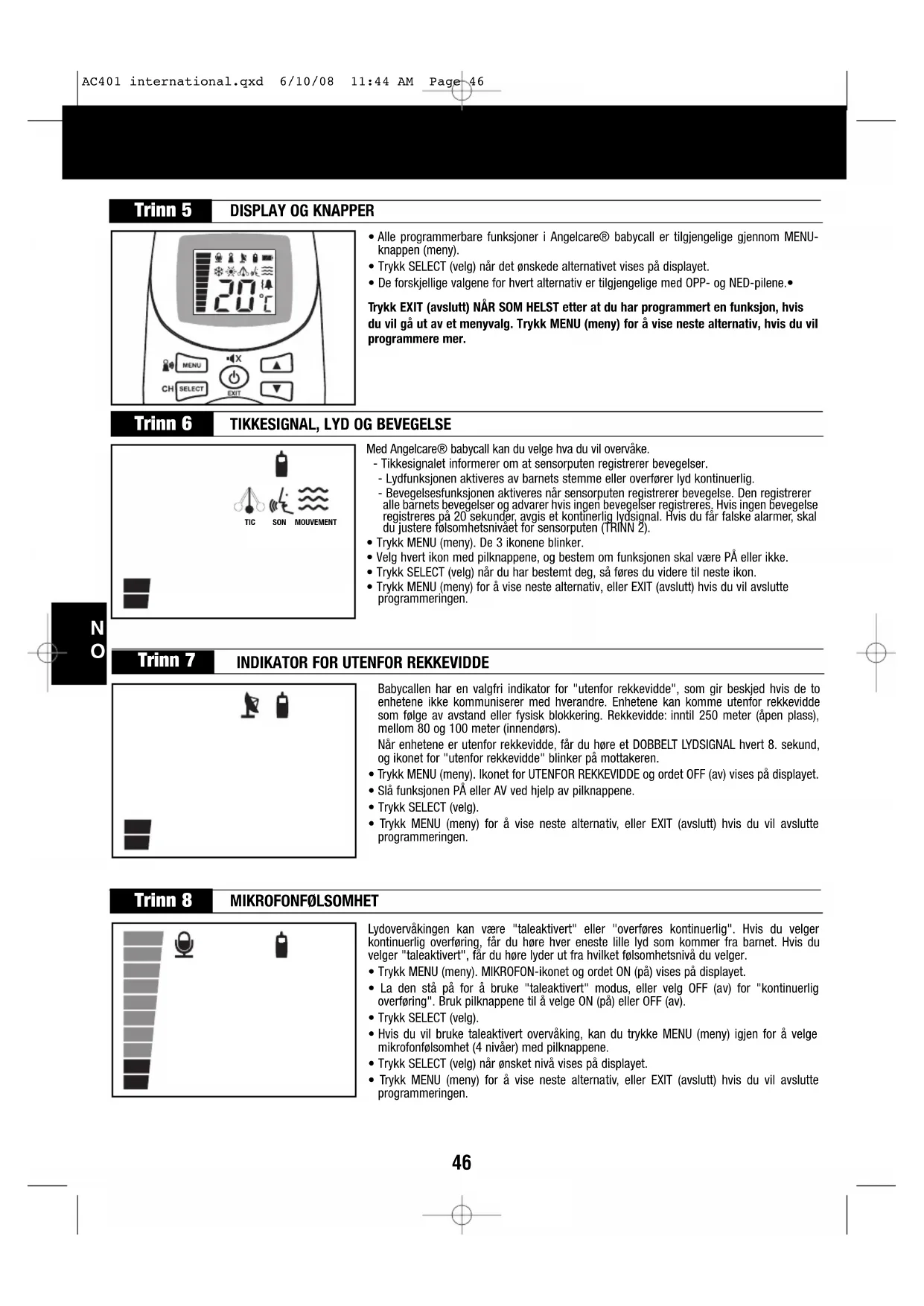 BEGRENSET GARANTI Angelcare® garanterer overfor den opprinnelige eieren av dette produktet at Angelcare® oppladbar babycall for bevegelse og lyd (modell AC401) er uten mangler i materialer og utførelse i en periode på ett (1) år fra den opprinnelige kjøpedatoen. Hvis babycallsystemet ikke fungerer som det skal i denne ettårsperioden når det brukes under normale forhold i samsvar med bruksanvisningen, skal Angelcare®, etter eget skjønn, enten reparere eller erstatte produktet gratis. Ta kontakt med distributøren. Produktet må returneres sammen med et kjøpsbevis, enten kvitteringen eller et annet dokument som viser at babycallsystemet fremdeles dekkes av garantien. Angelcare® skal dekke utgiftene til reparasjon eller erstatning samt fraktkostnadene tilbake til deg. Denne garantien gjelder ikke for et produkt som er skadet som følge av feil vedlikehold, ulykke, feil strømforsyning eller annen feilbruk. Garantien gjelder heller ikke hvis eieren reparerer eller modifiserer produktet. Angelcare® er ikke erstatningsansvarlig for påløpen skade eller følgeskade som måtte oppstå i forbindelse med dette produktet. Garantien utelukker andre former for erstatningsansvar enn det som er angitt ovenfor. Det gis ingen andre garantier. JURIDISKE RETTIGHETER VARIERER FRA LAND TIL LAND. ENKELTE LAND ANERKJENNER IKKE UNNTAK FOR ELLER BEGRENSNINGER I ANSVARET FOR PÅLØPEN SKADE ELLER FØLGESKADE. BEGRENSNINGENE OVENFOR GJELDER DERFOR IKKE NØDVENDIGVIS FOR DEG. VI ER IKKE PÅ NOEN MÅTE ANSVARLIGE FOR RESULTATENE AV BRUKEN AV DETTE PRODUKTET. VIKTIG! Angelcare® babycall er et produkt til personlig bruk. Produktet skal ikke returneres til butikken. Ring distributøren hvis du lurer på noe eller trenger hjelp, før du returnerer produktet. Dette apparatet oppfyller kravene i del 15 i FCC-reglene. Bruken er underlagt følgende to vilkår: (1) apparatet kan ikke forårsake skadelige forstyrrelser, og (2) apparatet må kunne ta imot eventuelle forstyrrelser som mottas, herunder forstyrrelser som kan føre til uønsket bruk. ADVARSEL: Endringer eller modifikasjoner på dette utstyret som ikke er uttrykkelig godkjent av den som har godkjenningsansvaret, kan medføre at brukeren mister sin tillatelse til å bruke utstyret. MERK: Dette utstyret er testet og er i samsvar med grensene for digitale apparater i klasse B, jfr. del 15 i FCC-reglene. Disse grensene skal gi rimelig beskyttelse mot skadelig interferens i boliginstallasjoner. Dette utstyret utvikler, bruker og kan utstråle radiofrekvensenergi. Hvis utstyret ikke installeres og brukes i samsvar med anvisningene, kan det forårsake skadelig interferens på radiokommunikasjon. Det gis likevel ingen garanti for at interferens ikke vil oppstå i en bestemt installasjon. Hvis dette utstyret forårsaker skadelig interferens på radio- eller tv-signaler, noe som kan fastslås ved å slå utstyret av og på, bør brukeren prøve å løse problemet ved hjelp av ett eller flere av disse tiltakene: - Snu eller flytt på mottakerantennen. - Øk avstanden mellom utstyret og mottakeren. - Kople utstyret til en stikkontakt i en annen strømkrets enn den mottakeren er koplet til. - Ta kontakt med en forhandler eller en kyndig radio-/tv-tekniker for å få hjelp. OBS! - Reduser risikoen for elektrisk støt ved å unngå å utsette apparatet for regn eller fuktighet. - Batteriet kan eksplodere hvis det settes i feil. 4 oppladbare NIMH-batterier av typen AAA medfølger.Batteriene er produsert av Sanik Battery Co. Ltd. SN-AAA60HJ 1,2 V 600 mAh/ GPI International Limited, GN60AAAHC, 1.2V 600mAh. Batteriene skal bare skiftes ut med 4 oppladbare NIHM-batterier av typen AAA. Overføring: 927 MHz (USA og Canada). 864 MHz (Europa, Asia, Afrika, Oseania). Informasjonsoverføring mellom mottaker og sender gjøres på frekvensen 2,4 GHz. Beskytt miljøet! Dette elektroniske utstyret inneholder materialer som kan gjenbrukes, og må ikke kastes i restavfallet. Ta det med til et innsamlingssted for elektrisk og elektronisk utstyr (forhør deg med kommunen). AC401 international.qxd 6/10/08 11:44 AM Page 5051