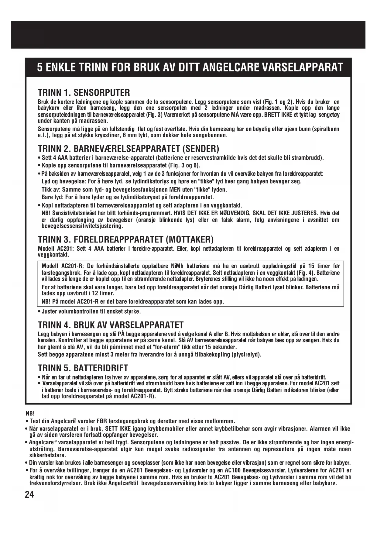 ensorputene må eventuelt justeres (henvis til bevegelsessensitivitsjustering avsnittet. Trinn 3. For å stoppe alarmen, legg hånden lett på madrassen slik at sensorputene oppfatter bevegelse igjen. Det røde alarmlyset på barneværelseapparatet vil fortsette å blinke i 1 minutt (Fig. 3). Trinn 4. Kontroller den oppladbare batteri-funksjonen ved å bruke begge varselapparatene uten nettadapterene. Strømindikator skal lyse grønt på begge apparatene. Foreldreapparatet: Skift batterier øyeblikkelig på model AC201 når det oransje Dårlig Batteri-indikator lyset kommer på. Lad opp foreldreapparatet på model AC201-R. Barneværelseapparatet: Skift batterier øyeblikkelig når det oransje Dårlig Batteri-indikator lyset kommer på og en hører en rask "klikking". Hvis ikke dette blir gjort, vil lyset til slutt skifte til rødt og varsleren vil ikke lenger være i drift. Brukstips Bevegelsessensitivitetstjustering Sensistivitetsnivået har blitt forhånds-programmert for å kunne dekke de fleste forhold. Men, under visse omstendigheter, kan sensivitetsnivået ikke være ideelt. Øk IKKE sensitivitetsnivået med mindre det stadig er falsk alarm og du har fulgt rådene i problemløsningsavsnittet ang. falsk alarm. Legg merke til den forhåndsprogrammerte innstillingen i tilfelle du vil gå tilbake til den opprinnelig innstillingen. Bevegelsesindikatoren på barneværelseapparatet vil blinke oransje når varsleren bare såvidt kan registrere bevegelser. Grunnen kan være at babyen sover meget tungt eller har flyttet seg vekk fra sensorputene og ligger helt på kanten av sengen. Hvis alarmen IKKE lyder, trenger en ikke å justere sensitiviteten. Hvis bevegelsesindikator-lyset blinker oransje mesteparten av tiden mens babyen ligger rett over sensorputene, kan en falsk alarm utløses. Hvis dette skjer, juster sensitivitetsnivået. Bruk reguleringskiven og øk til neste innstilling for å justere sensitivitetsnivået. Test varsleren igjen. Valg av kanal for lyd-mottakelse Sjekk hvilken kanal (A eller B) som gir best mottakelse. Pass på at begge apparatene alltid er på samme kanal. Hvis det er vedvarende forstyrrelser, referer til Problemløsning avsnittet. NB! Dette avlyttings-systemet er IKKE utstyrt med indikator som viser når apparatet er utenfor rekkevidde. Hvis foreldre- og barneværelseapparatet er for langt fra hverandre, vil ingen lyd bli mottatt. Gule Lydnivå-indikatorer De fire lysdioder for lydnivået lar deg se babyens lyder. Dess høyere babyens lyder, dess flere lysdioder lyser.opp.
