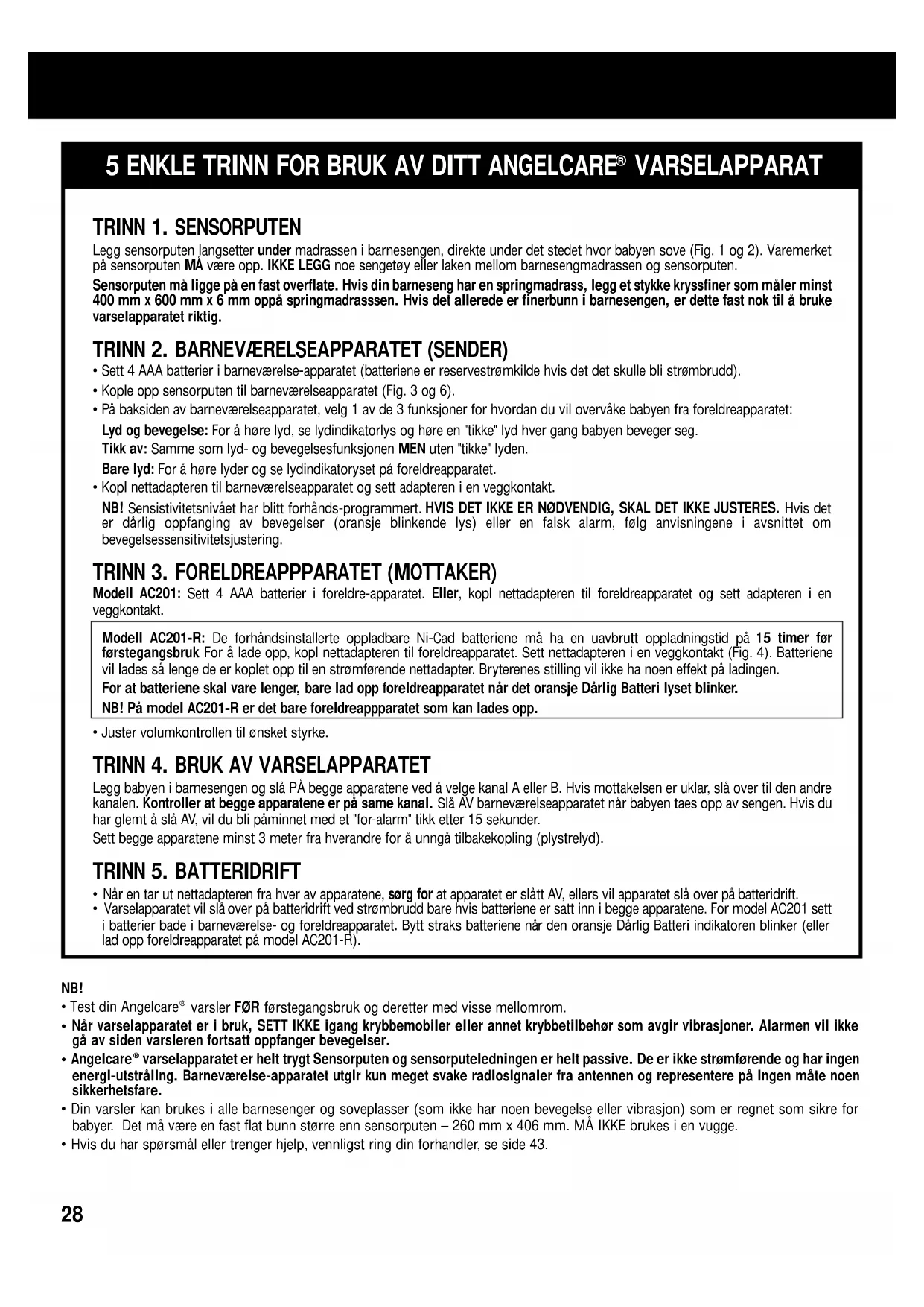 varselapparatet kan også brukes på andre steder babyen sover, og ikke bare i barnesengen. Test varsleren når sensorputen blir flyttet til et annet sted, for å forsikre at sensitivitetsnivået er riktig tilpasset det nye underlaget eller madrassen. Henvis til avsnittet om bevegelsessensivitetsjustering. Trinn 1. Sett funksjonsvalgbryteren på barneværelseapparatet til "Bare Lyd" ("Sound Only"). Be en person om å snakke inn i barneværelseapparatet eller sett en radio like ved Du bør høre lyd fra foreldreapparatet. Hvis det ikke er noen lyd, referer til Problemløsningavsnittet. Sjekk hvilken kanal (A eller B) som gir best mottakkelse. Pass på at begge apparaten alltid er på same kanal. Trinn 2. For å teste bevegelse i din varsler, sett bryteren på barneværelseapparatet i "Lyd og Bevegelse"("Sound and Movement") stilling. Bevegelsesindikatoren vil blinke rødt, grønt og til sist gi fra seg et enkelt tikk. Klapp forsiktig på madrassen. Det grønne lyset vil fortsette å blinke ved hver bevegelse. Ta hånden vekk fra madrassen. Fordi det nå ikke er noen bevegelse vil det gi fra seg ett "foralarm" tikk etter 15 sekunder. Fem sekunder deretter vil alarmen gå av og det røde lyset vil blinke uavbrutt. NB! Hvis alarmen ikke går av, kan det være at sensorputen plukker opp en vedvarende gulv-vibrasjon, sterk trekk eller barnesengen røres ved. Unngå å røre ved barnesengen når varselapparatet er i bruk. Sett sengen nær en fast bærevegg og vekk fra sterke luftstrømninger. Sensivitetsnivået på sensorputen må eventuelt justeres (henvis til bevegelsessensitivitsjustering avsnittet). Trinn 3. Alarmen vil stoppe hvis en klapper lett på madrassen slik at sensorputen oppfatter bevegelse igjen. Det røde alarmlyset på barneværelseapparatet vil fortsette å blinke i 1 minutt (Fig. 3). Trinn 4. Kontroller den oppladbare batteri-funksjonen ved å bruke begge varselapparatene uten nettadapterene. Strømindikator skal lyse grønt på begge apparatene. Foreldreapparatet: Skift batterier øyeblikkelig på model AC201 når det oransje Dårlig Batteri-indikator lyset kommer på. Lad opp foreldreapparatet på model AC201-R. Barneværelseapparatet: Skift batterier øyeblikkelig når det oransje Dårlig Batteri-indikator lyset kommer på og en hører en rask "klikking". Hvis ikke dette blir gjort, vil lyset til slutt skifte til rødt og varsleren vil ikke lenger være i drift. Brukstips Bevegelsessensitivitetstjustering Sensistivitetsnivået har blitt forhånds-programmert for å kunne dekke de fleste forhold. Men, under visse omstendigheter, kan sensivitetsnivået ikke være ideelt. Øk IKKE sensitivitetsnivået med mindre det stadig er falsk alarm og du har fulgt rådene i problemløsningsavsnittet ang. falsk alarm. Legg merke til den forhåndsprogrammerte innstillingen i tilfelle du vil gå tilbake til den opprinnelig innstillingen. Bevegelsesindikatoren på barneværelseapparatet vil blinke oransje når varsleren bare såvidt kan registrere bevegelser. Grunnen kan være at babyen sover meget tungt eller har flyttet seg vekk fra sensorputen og ligger helt på kanten av sengen. Hvis alarmen IKKE lyder, trenger en ikke å justere sensitiviteten. Hvis bevegelsesindikator-lyset blinker oransje mesteparten av tiden mens babyen ligger rett over sensoren, vil varsleren høyst sannsynlig utløse en falsk alarm. Hvis dette skjer, juster sensitivitetsnivået. For å justere sensitivitetnivået legg babyen ned på madrassen eller underlaget og vent til babyen sover og ligger stille. Dette gir en mere nøyaktig instilling. Sett reguleringsskiven på 5 og fortsett ved å minske sensitivitetsnivået inntil det blinkende oransje lyset kommer på. Øk deretter sakte til det grønne lyset kommer igjen. Legg til 0,5 punkt på sensitivitetsnivået (f.eks. hvis det grønne lyset viser seg på 3 sett reguleringskiven på 3,5) Test varselapparatet på nytt. Valg av kanal for lyd-mottakelse Sjekk hvilken kanal (A eller B) som gir best mottakelse. Pass på at begge apparatene alltid er på samme kanal. Hvis det er vedvarende forstyrrelser, referer til Problemløsning avsnittet. NB! Dette avlyttings-systemet er IKKE utstyrt med indikator som viser når apparatet er utenfor rekkevidde. Hvis foreldre- og barneværelseapparatet er for langt fra hverandre, vil ingen lyd bli mottatt. Gule Lydnivå-indikatorer De fire lysdioder for lydnivået lar deg se babyens lyder. Dess høyere babyens lyder, dess flere lysdioder lyser.opp.