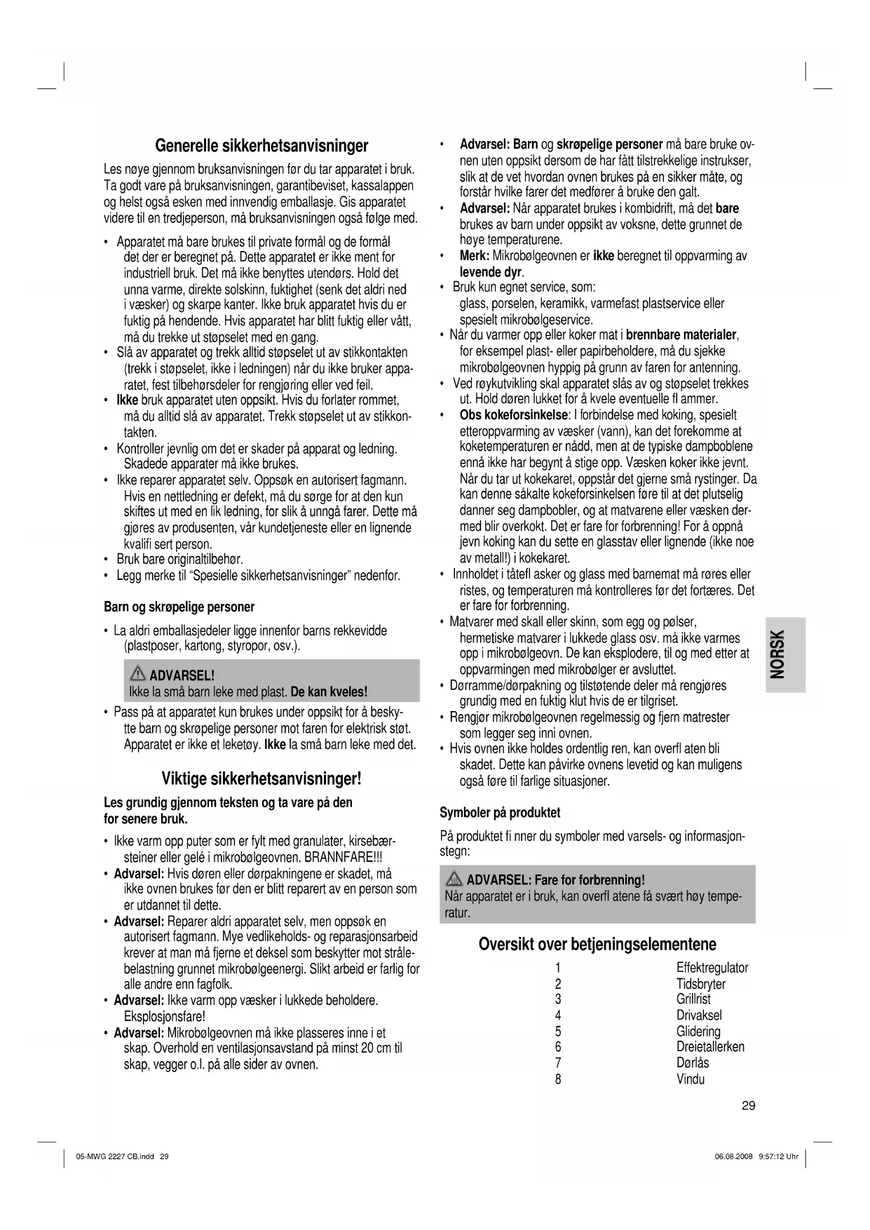 - Hvis ovnen ikke holdes ordentlig ren, kan overfl aten bli skadet. Dette kan påvirke ovnens levetid og kan muligens også føre til farlige situasjoner. Symboler på produktet På produktet fi nner du symboler med varsels- og informasjon- stegn: ADVARSEL: Fare for forbrenning! Når apparatet er i bruk, kan overfl atene få svært høy tempe- ratur. Oversikt over betjeningselementene 1 Effektregulator 2 Tidsbryter 3 Grillrist 4 Drivaksel 5 Glidering 6 Dreietallerken 7 Dørlås 8 Vindu 05-MWG 2227 CB.indd 2905-MWG 2227 CB.indd 29 06.08.2008 9:57:12 Uhr06.08.2008 9:57:12 Uhr30 NORSK NORSK Hensiktsmessig bruk Dette apparatet er ment for: