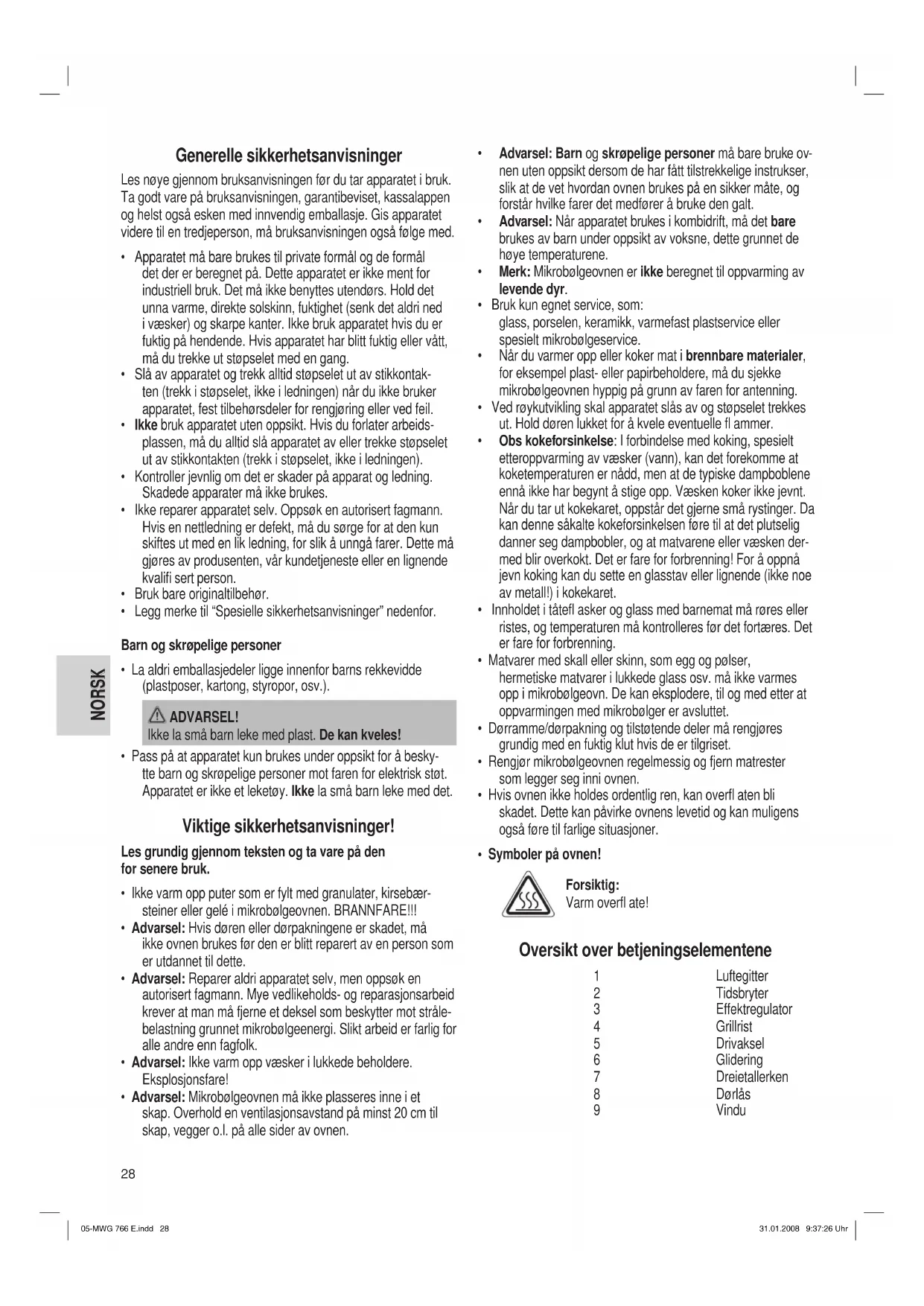 - Advarsel: Når apparatet brukes i kombidrift, må det bare brukes av barn under oppsikt av voksne, dette grunnet de høye temperaturene.