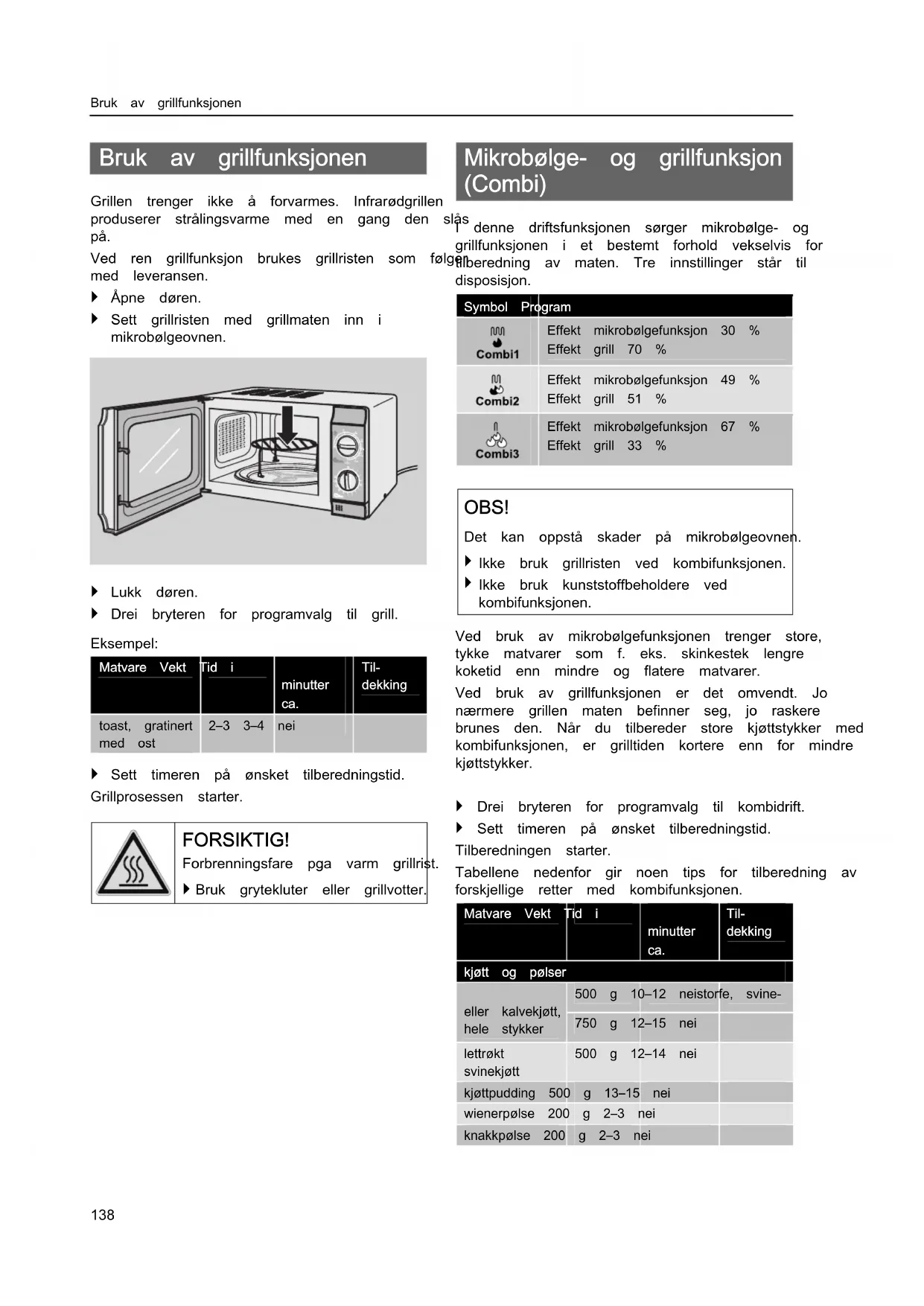Bruk grytekluter eller grillvotter. Mikrobølge- og grillfunksjon (Combi) I denne driftsfunksjonen sørger mikrobølge- og grillfunksjonen i et bestemt forhold vekselvis for tilberedning av maten. Tre innstillinger står til disposisjon. Symbol ProgramEffekt mikrobølgefunksjon 30 %Effekt grill 70 %Effekt mikrobølgefunksjon 49 %Effekt grill 51 %Effekt mikrobølgefunksjon 67 %Effekt grill 33 % OBS! Det kan oppstå skader på mikrobølgeovnen. Ikke bruk grillristen ved kombifunksjonen. Ikke bruk kunststoffbeholdere vedkombifunksjonen.Ved bruk av mikrobølgefunksjonen trenger store,tykke matvarer som f. eks. skinkestek lengrekoketid enn mindre og flatere matvarer.Ved bruk av grillfunksjonen er det omvendt. Jonærmere grillen maten befinner seg, jo raskerebrunes den. Når du tilbereder store kjøttstykker medkombifunksjonen, er grilltiden kortere enn for mindrekjøttstykker. Drei bryteren for programvalg til kombidrift. Sett timeren på ønsket tilberedningstid.Tilberedningen starter.Tabellene nedenfor gir noen tips for tilberedning avforskjellige retter med kombifunksjonen.Matvare Vekt Tid iminutter ca. Til- dekkingkjøtt og pølser500 g 10–12 neistorfe, svine-eller kalvekjøtt,hele stykker750 g 12–15 neilettrøktsvinekjøtt500 g 12–14 neikjøttpudding 500 g 13–15 neiwienerpølse 200 g 2–3 neiknakkpølse 200 g 2–3 neiMikrobølge- og grillfunksjon (Combi)