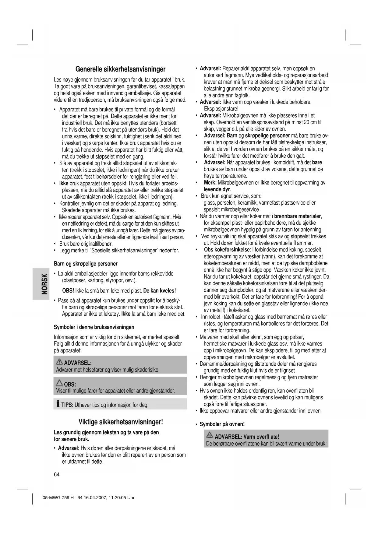- Hvis du må skifte lyset i ovnen, må du henvende deg til et lokalt spesialverksted. Tekniske data Modell:........................................................................MWG 759 H Spenningsforsyning: .................................................230 V, 50 Hz Inngangsstrøm: mikrobølgeovn:........................................................... 1400 W varmluft:...................................................................... 1300 W grill: ............................................................................. 1000 W Beregnet mikrobølgeutgangseffekt:....................................900 W Ovnens volum: ....................................................................25 liter Beskyttelsesklasse:...................................................................... Ι Dette apparatet har blitt testet i henhold til alle aktuelle CE- retningslinjer som det rammes av, f.eks. elektromagnetisk toleranse og direktiver om lavspenning. Det er laget i henhold til dagens nyeste sikkerhetstekniske forskrifter. Med forbehold om tekniske endringer! Garanti For apparat som vi har solgt, påtar vi oss en garanti på 24 måneder fra kjøpsdato (kassalapp). Innenfor garantitiden fjerner vi mangler på apparat eller tilbehør uten omkostninger hvis manglene skyldes material- eller produksjonsfeil. Dette gjør vi ved reparasjon eller – etter vår vurdering – bytting. Garantiytelser medfører ingen forlengelse av garantitiden, og det oppstår heller ikke noe krav på en ny garanti på grunn av dette! Som garantibevis gjelder kjøpsbeviset. Uten dette beviset kan du ikke få byttet eller reparert apparatet gratis. I forbindelse med garanti ber vi om at du gir hele apparatet i ori- ginalemballasjen sammen med kassalappen til din forhandler. Verken defekter på forbrukstilbehør og slitasjedeler eller reng- jøring, vedlikehold og utskifting av slitasjedeler går inn under garantien. Slike ting er derfor kostnadspliktige! Garantien utgår ved inngrep utenfra. Etter garantien Etter at garantitiden har gått ut, kan reparasjoner utføres av den aktuelle faghandelen eller reparasjonsservice mot betaling. 05-MWG 759 H 72 16.04.2007, 11:20:21 UhrNORSK ENGLISH ENGLISH