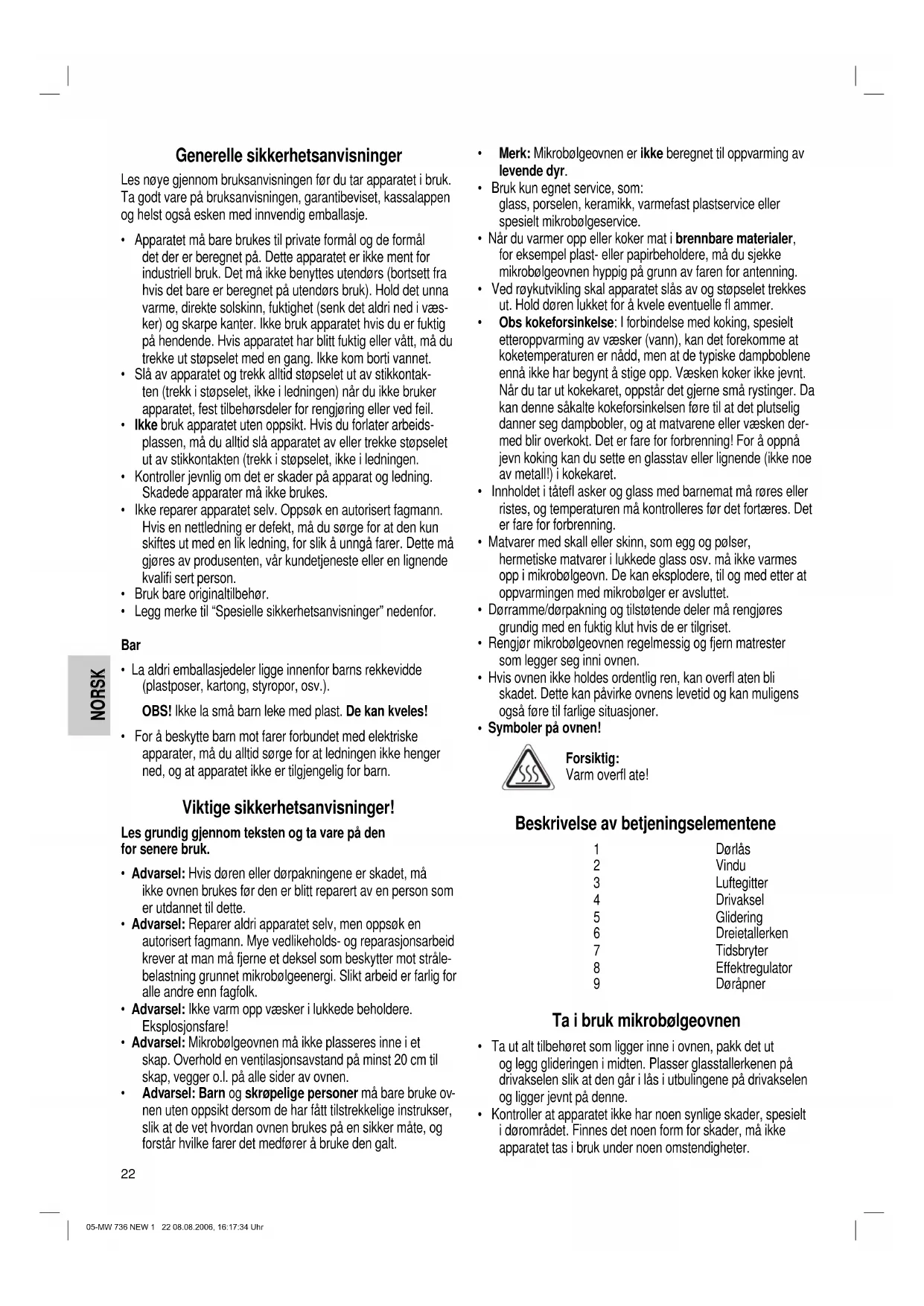 - Kontroller at apparatet ikke har noen synlige skader, spesielt i dørområdet. Finnes det noen form for skader, må ikke apparatet tas i bruk under noen omstendigheter. 05-MW 736 NEW 1 22 08.08.2006, 16:17:34 UhrNORSK