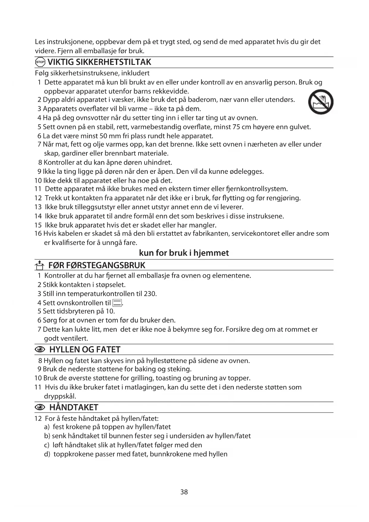 Følg sikkerhetsinstruksene, inkludert 1 Dette apparatet må kun bli brukt av en eller under kontroll av en ansvarlig person. Bruk og oppbevar apparatet utenfor barns rekkevidde. 2 Dypp aldri apparatet i væsker, ikke bruk det på baderom, nær vann eller utendørs. 3 Apparatets overflater vil bli varme – ikke ta på dem. 4 Ha på deg ovnsvotter når du setter ting inn i eller tar ting ut av ovnen. 5 Sett ovnen på en stabil, rett, varmebestandig overflate, minst 75 cm høyere enn gulvet. 6 La det være minst 50 mm fri plass rundt hele apparatet. 7 Når mat, fett og olje varmes opp, kan det brenne. Ikke sett ovnen i nærheten av eller under skap, gardiner eller brennbart materiale. 8 Kontroller at du kan åpne døren uhindret. 9 Ikke la ting ligge på døren når den er åpen. Den vil da kunne ødelegges. 10 Ikke dekk til apparatet eller ha noe på det. 11 Dette apparatet må ikke brukes med en ekstern timer eller ernkontrollsystem. 12 Trekk ut kontakten fra apparatet når det ikke er i bruk, før flytting og før rengjøring. 13 Ikke bruk tilleggsutstyr eller annet utstyr annet enn de vi leverer. 14 Ikke bruk apparatet til andre formål enn det som beskrives i disse instruksene. 15 Ikke bruk apparatet hvis det er skadet eller har mangler. 16 Hvis kabelen er skadet så må den bli erstattet av fabrikanten, servicekontoret eller andre som er kvalifiserte for å unngå fare. kun for bruk i hjemmet