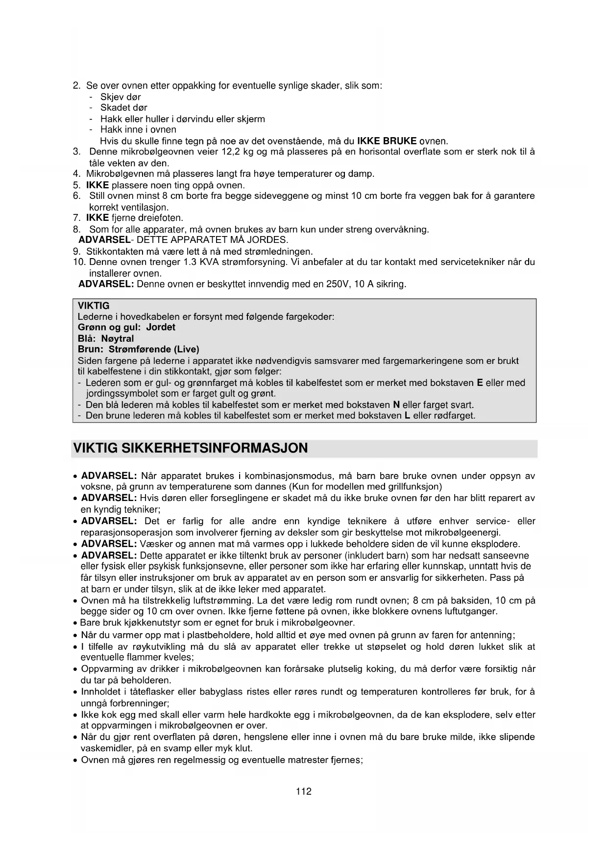 installerer ovnen. ADVARSEL: Denne ovnen er beskyttet innvendig med en 250V, 10 A sikring. VIKTIG Lederne i hovedkabelen er forsynt med følgende fargekoder: Grønn og gul: Jordet Blå: Nøytral Brun: Strømførende (Live) Siden fargene på lederne i apparatet ikke nødvendigvis samsvarer med fargemarkeringene som er brukt til kabelfestene i din stikkontakt, gjør som følger: - Lederen som er gul- og grønnfarget må kobles til kabelfestet som er merket med bokstaven E eller med jordingssymbolet som er farget gult og grønt. - Den blå lederen må kobles til kabelfestet som er merket med bokstaven N eller farget svart. - Den brune lederen må kobles til kabelfestet som er merket med bokstaven L eller rødfarget. VIKTIG SIKKERHETSINFORMASJON ADVARSEL: Når apparatet brukes i kombinasjonsmodus, må barn bare bruke ovnen under oppsyn av voksne, på grunn av temperaturene som dannes (Kun for modellen med grillfunksjon) ADVARSEL: Hvis døren eller forseglingene er skadet må du ikke bruke ovnen før den har blitt reparert av en kyndig tekniker; ADVARSEL: Det er farlig for alle andre enn kyndige teknikere å utføre enhver service- eller reparasjonsoperasjon som involverer fjerning av deksler som gir beskyttelse mot mikrobølgeenergi. ADVARSEL: Væsker og annen mat må varmes opp i lukkede beholdere siden de vil kunne eksplodere. ADVARSEL: Dette apparatet er ikke tiltenkt bruk av personer (inkludert barn) som har nedsatt sanseevne eller fysisk eller psykisk funksjonsevne, eller personer som ikke har erfaring eller kunnskap, unntatt hvis de får tilsyn eller instruksjoner om bruk av apparatet av en person som er ansvarlig for sikkerheten. Pass på at barn er under tilsyn, slik at de ikke leker med apparatet. Ovnen må ha tilstrekkelig luftstrømming. La det være ledig rom rundt ovnen; 8 cm på baksiden, 10 cm på begge sider og 10 cm over ovnen. Ikke fjerne føttene på ovnen, ikke blokkere ovnens luftutganger. Bare bruk kjøkkenutstyr som er egnet for bruk i mikrobølgeovner. Når du varmer opp mat i plastbeholdere, hold alltid et øye med ovnen på grunn av faren for antenning; I tilfelle av røykutvikling må du slå av apparatet eller trekke ut støpselet og hold døren lukket slik at eventuelle flammer kveles; Oppvarming av drikker i mikrobølgeovnen kan forårsake plutselig koking, du må derfor være forsiktig når du tar på beholderen. Innholdet i tåteflasker eller babyglass ristes eller røres rundt og temperaturen kontrolleres før bruk, for å unngå forbrenninger; Ikke kok egg med skall eller varm hele hardkokte egg i mikrobølgeovnen, da de kan eksplodere, selv etter at oppvarmingen i mikrobølgeovnen er over. Når du gjør rent overflaten på døren, hengslene eller inne i ovnen må du bare bruke milde, ikke slipende vaskemidler, på en svamp eller myk klut. Ovnen må gjøres ren regelmessig og eventuelle matrester fjernes;113 Manglende renhold kan føre til at overflaten skades og kan ha innvirking på apparatets levetid og eventuelt føre til farlige situasjoner; Hvis strømledningen er skadet må den skiftes ut av produsenten, produsentens servicetekniker eller liknende kvalifisert person for å unngå fare.