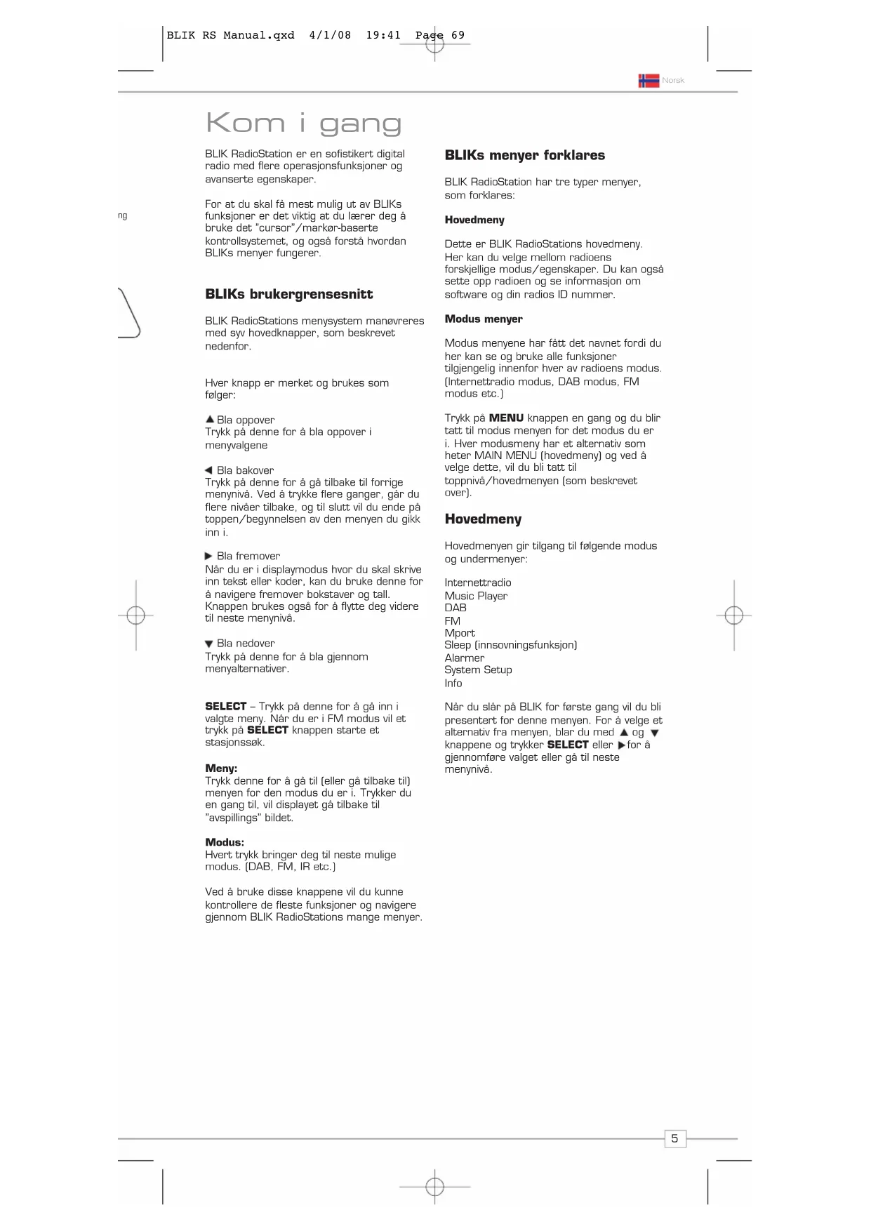 BLIK RadioStation er en sofistikert digital radio med flere operasjonsfunksjoner og avanserte egenskaper. For at du skal få mest mulig ut av BLIKs funksjoner er det viktig at du lærer deg å bruke det ”cursor”/markør-baserte kontrollsystemet, og også forstå hvordan BLIKs menyer fungerer. BLIKs brukergrensesnitt BLIK RadioStations menysystem manøvreres med syv hovedknapper, som beskrevet nedenfor. Hver knapp er merket og brukes som følger: Bla oppover Trykk på denne for å bla oppover i menyvalgene Bla bakover Trykk på denne for å gå tilbake til forrige menynivå. Ved å trykke flere ganger, går du flere nivåer tilbake, og til slutt vil du ende på toppen/begynnelsen av den menyen du gikk inn i. Bla fremover Når du er i displaymodus hvor du skal skrive inn tekst eller koder, kan du bruke denne for å navigere fremover bokstaver og tall. Knappen brukes også for å flytte deg videre til neste menynivå. Bla nedover Trykk på denne for å bla gjennom menyalternativer. SELECT – Trykk på denne for å gå inn i valgte meny. Når du er i FM modus vil et trykk på SELECT knappen starte et stasjonssøk. Meny: Trykk denne for å gå til (eller gå tilbake til) menyen for den modus du er i. Trykker du en gang til, vil displayet gå tilbake til ”avspillings” bildet. Modus: Hvert trykk bringer deg til neste mulige modus. (DAB, FM, IR etc.) Ved å bruke disse knappene vil du kunne kontrollere de fleste funksjoner og navigere gjennom BLIK RadioStations mange menyer. BLIKs menyer forklares BLIK RadioStation har tre typer menyer, som forklares: Hovedmeny Dette er BLIK RadioStations hovedmeny. Her kan du velge mellom radioens forskjellige modus/egenskaper. Du kan også sette opp radioen og se informasjon om software og din radios ID nummer. Modus menyer Modus menyene har fått det navnet fordi du her kan se og bruke alle funksjoner tilgjengelig innenfor hver av radioens modus. (Internettradio modus, DAB modus, FM modus etc.) Trykk på MENU knappen en gang og du blir tatt til modus menyen for det modus du er