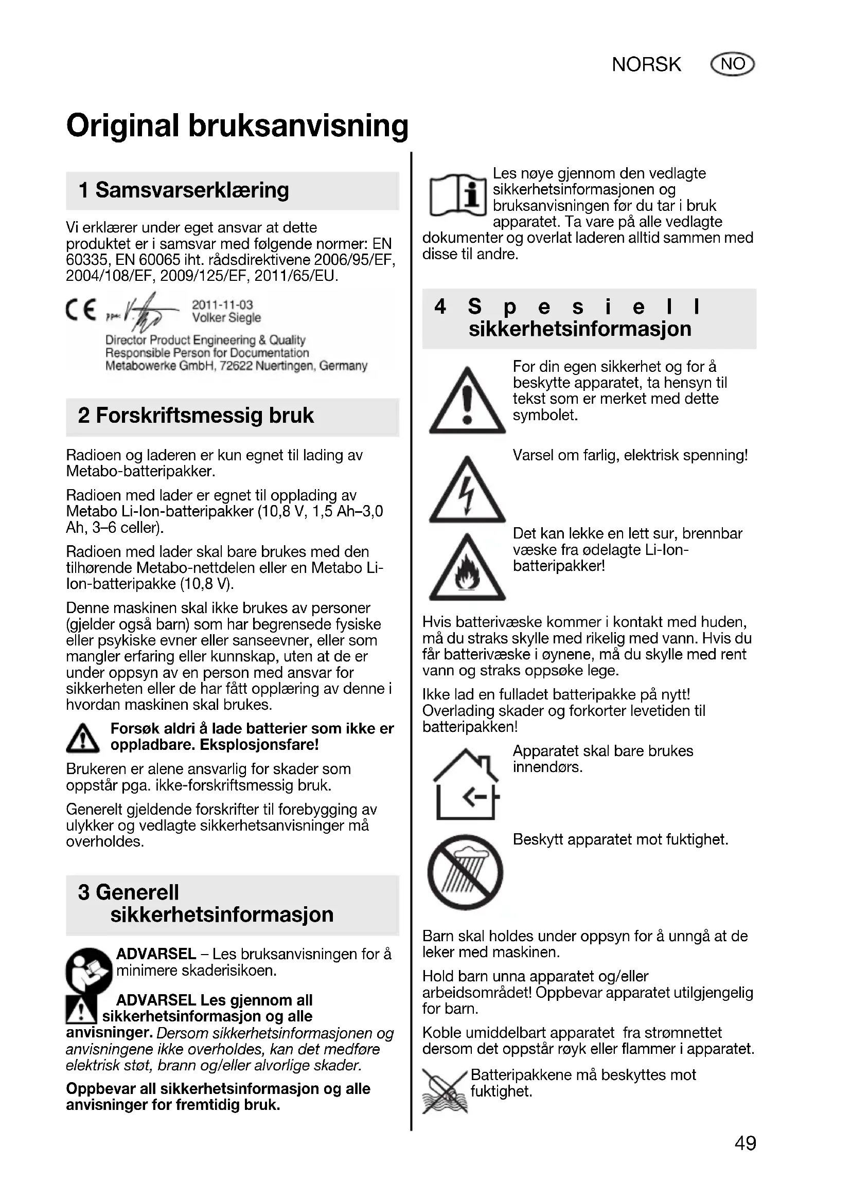 Vi erklærer under eget ansvar at dette produktet er i samsvar med følgende normer: EN 60335, EN 60065 iht. rådsdirektivene 2006/95/EF, 2004/108/EF, 2009/125/EF, 2011/65/EU. Radioen og laderen er kun egnet til lading av Metabo-batteripakker. Radioen med lader er egnet til opplading av Metabo Li-Ion-batteripakker (10,8 V, 1,5 Ah–3,0 Ah, 3–6 celler). Radioen med lader skal bare brukes med den tilhørende Metabo-nettdelen eller en Metabo Li- Ion-batteripakke (10,8 V). Denne maskinen skal ikke brukes av personer (gjelder også barn) som har begrensede fysiske eller psykiske evner eller sanseevner, eller som mangler erfaring eller kunnskap, uten at de er under oppsyn av en person med ansvar for sikkerheten eller de har fått opplæring av denne i hvordan maskinen skal brukes. Forsøk aldri å lade batterier som ikke er oppladbare. Eksplosjonsfare! Brukeren er alene ansvarlig for skader som oppstår pga. ikke-forskriftsmessig bruk. Generelt gjeldende forskrifter til forebygging av ulykker og vedlagte sikkerhetsanvisninger må overholdes. ADVARSEL – Les bruksanvisningen for å minimere skaderisikoen. ADVARSEL Les gjennom all sikkerhetsinformasjon og alle anvisninger. Dersom sikkerhetsinformasjonen og anvisningene ikke overholdes, kan det medføre elektrisk støt, brann og/eller alvorlige skader. Oppbevar all sikkerhetsinformasjon og alle anvisninger for fremtidig bruk. Les nøye gjennom den vedlagte sikkerhetsinformasjonen og bruksanvisningen før du tar i bruk apparatet. Ta vare på alle vedlagte dokumenter og overlat laderen alltid sammen med disse til andre. For din egen sikkerhet og for å beskytte apparatet, ta hensyn til tekst som er merket med dette symbolet. Varsel om farlig, elektrisk spenning! Det kan lekke en lett sur, brennbar væske fra ødelagte Li-Ion- batteripakker! Hvis batterivæske kommer i kontakt med huden, må du straks skylle med rikelig med vann. Hvis du får batterivæske i øynene, må du skylle med rent vann og straks oppsøke lege. Ikke lad en fulladet batteripakke på nytt! Overlading skader og forkorter levetiden til batteripakken! Apparatet skal bare brukes innendørs. Beskytt apparatet mot fuktighet. Barn skal holdes under oppsyn for å unngå at de leker med maskinen. Hold barn unna apparatet og/eller arbeidsområdet! Oppbevar apparatet utilgjengelig for barn. Koble umiddelbart apparatet fra strømnettet dersom det oppstår røyk eller flammer i apparatet. Batteripakkene må beskyttes mot fuktighet. Original bruksanvisning 1 Samsvarserklæring 2 Forskriftsmessig bruk 3 Generell sikkerhetsinformasjon 4Spesiell sikkerhetsinformasjon50 NORSK