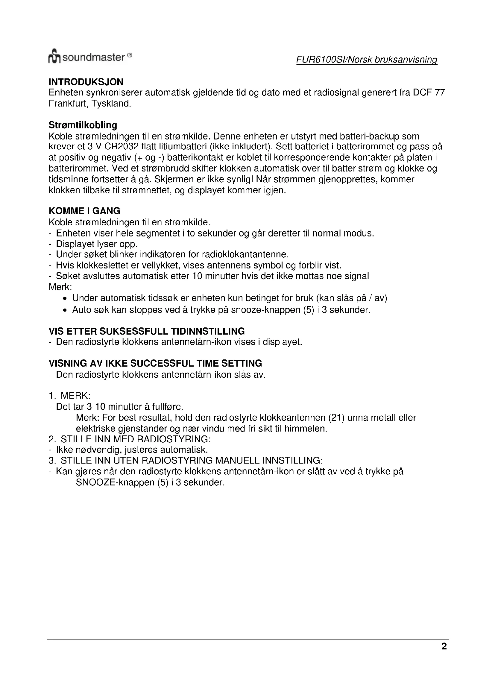FUR6100SI - Radioklokke Soundmaster - Gratis bruksanvisning og manual