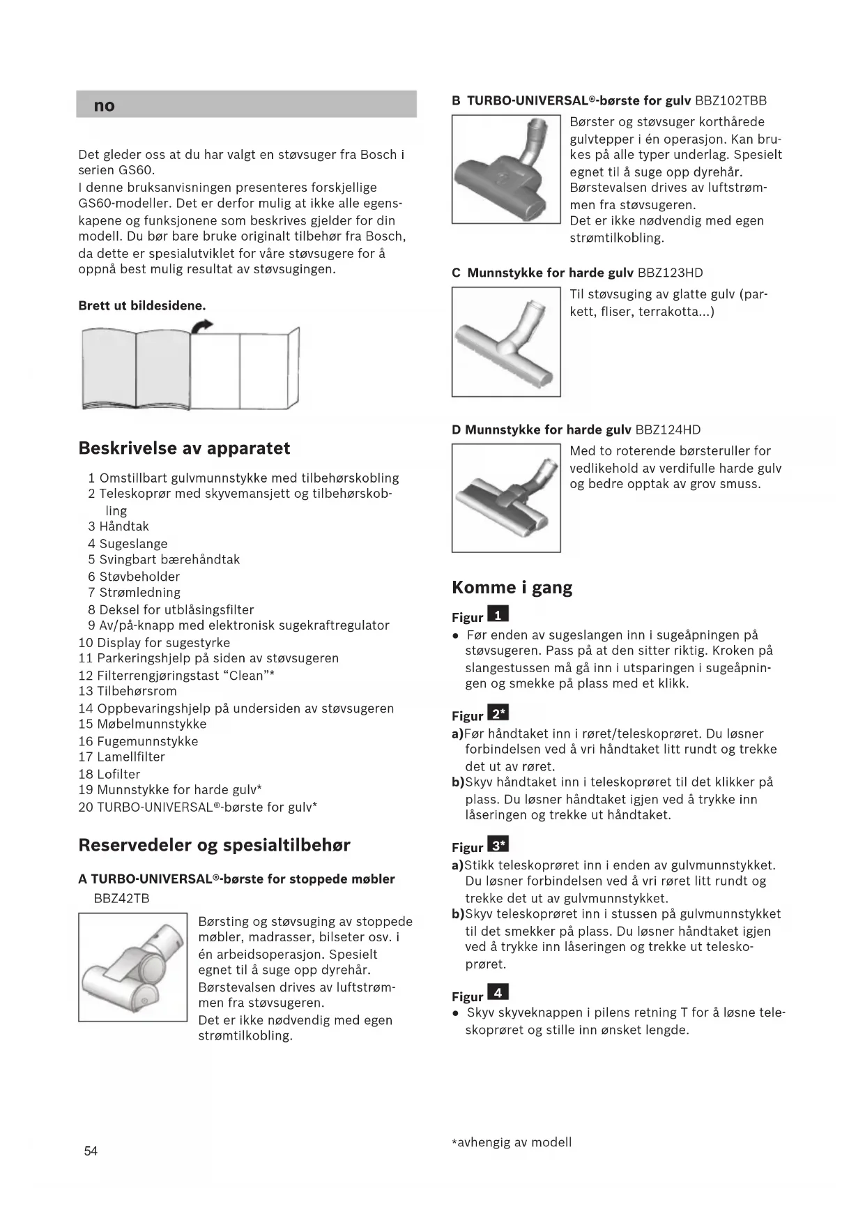 erien GS60. I denne bruksanvisningen presenteres forskjellige GS60-modeller. Det er derfor mulig at ikke alle egens- kapene og funksjonene som beskrives gjelder for din modell. Du bør bare bruke originalt tilbehør fra Bosch, da dette er spesialutviklet for våre støvsugere for å oppnå best mulig resultat av støvsugingen. Brett ut bildesidene. Beskrivelse av apparatet 1 Omstillbart gulvmunnstykke med tilbehørskobling 2 Teleskoprør med skyvemansjett og tilbehørskob- ling 3 Håndtak 4 Sugeslange 5 Svingbart bærehåndtak 6 Støvbeholder 7 Strømledning 8 Deksel for utblåsingsfilter 9 Av/på-knapp med elektronisk sugekraftregulator 10 Display for sugestyrke 11 Parkeringshjelp på siden av støvsugeren 12 Filterrengjøringstast “Clean”* 13 Tilbehørsrom 14 Oppbevaringshjelp på undersiden av støvsugeren 15 Møbelmunnstykke 16 Fugemunnstykke 17 Lamellfilter 18 Lofilter 19 Munnstykke for harde gulv* 20 TURBO-UNIVERSAL®-børste for gulv* Reservedeler og spesialtilbehør A TURBO-UNIVERSAL®-børste for stoppede møbler BBZ42TB Børsting og støvsuging av stoppede møbler, madrasser, bilseter osv. i én arbeidsoperasjon. Spesielt egnet til å suge opp dyrehår. Børstevalsen drives av luftstrøm- men fra støvsugeren. Det er ikke nødvendig med egen strømtilkobling.