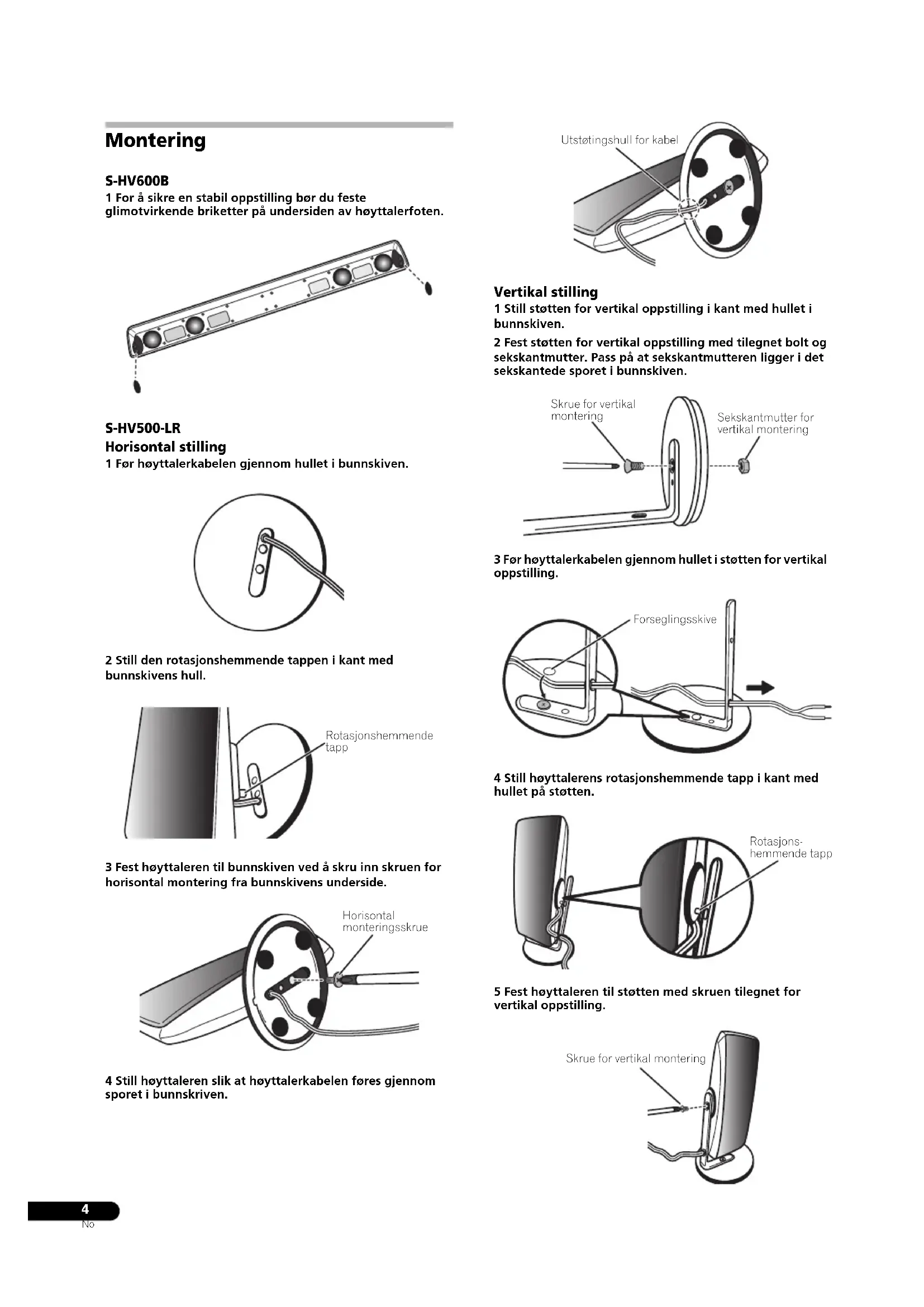 Montering S-HV600B 1 For å sikre en stabil oppstilling bør du feste glimotvirkende briketter på undersiden av høyttalerfoten. S-HV500-LR Horisontal stilling 1 Før høyttalerkabelen gjennom hullet i bunnskiven. 2 Still den rotasjonshemmende tappen i kant med bunnskivens hull. 3 Fest høyttaleren til bunnskiven ved å skru inn skruen for horisontal montering fra bunnskivens underside. 4 Still høyttaleren slik at høyttalerkabelen føres gjennom sporet i bunnskriven. Vertikal stilling 1 Still støtten for vertikal oppstilling i kant med hullet i bunnskiven. 2 Fest støtten for vertikal oppstilling med tilegnet bolt og sekskantmutter. Pass på at sekskantmutteren ligger i det sekskantede sporet i bunnskiven. 3 Før høyttalerkabelen gjennom hullet i støtten for vertikal oppstilling. 4 Still høyttalerens rotasjonshemmende tapp i kant med hullet på støtten. 5 Fest høyttaleren til støtten med skruen tilegnet for vertikal oppstilling. Rotasjonshemmende tapp Horisontal monteringsskrue Utstøtingshull for kabel Skrue for vertikal montering Sekskantmutter for vertikal montering Forseglingsskive Rotasjons- hemmende tapp Skrue for vertikal montering S-HV600B_S-HV500-LR_En.fm 4 ページ 2011年4月12日 火曜日 午後6時47分5
