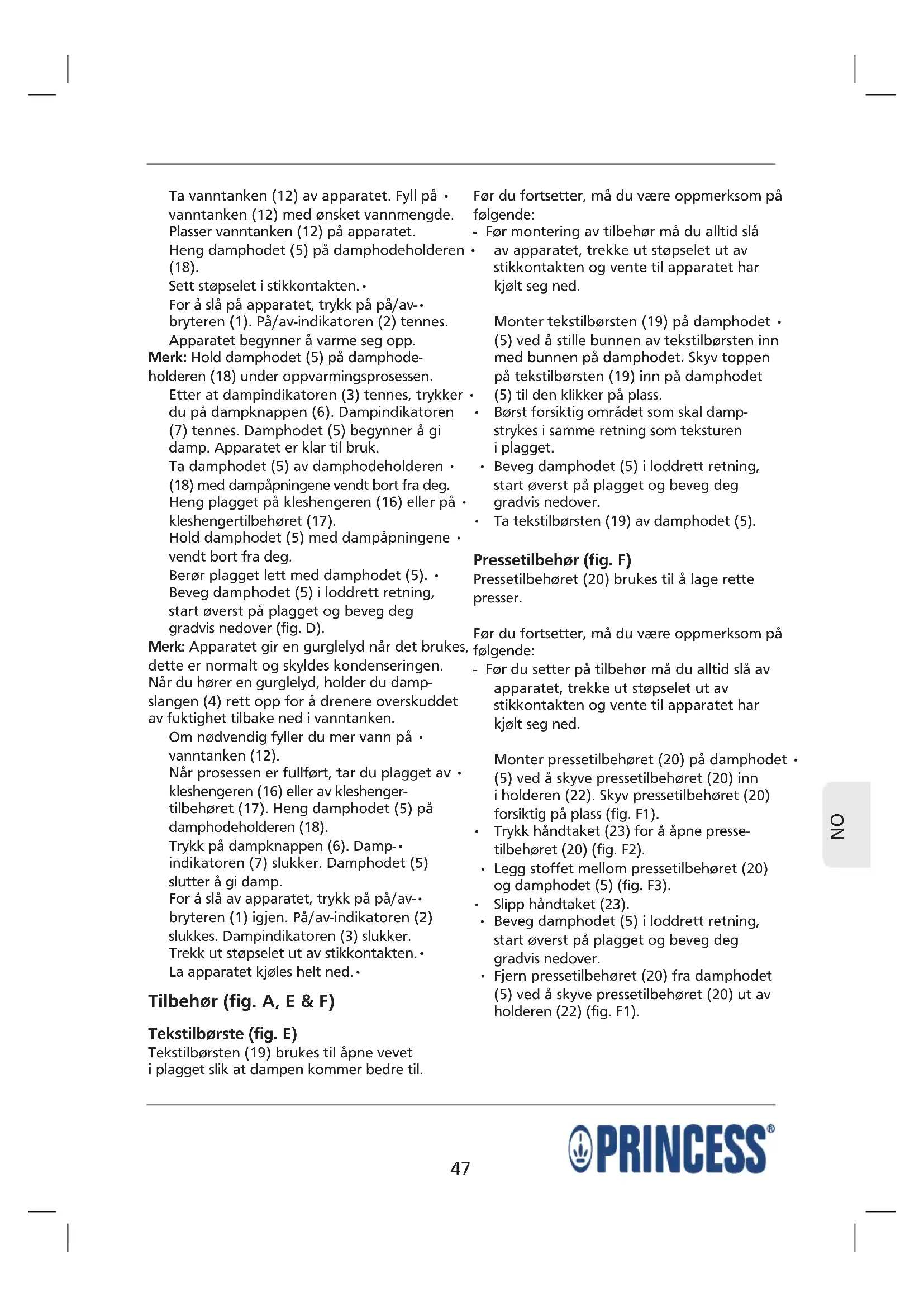 Rengjøring og vedlikehold Før du fortsetter, må du være oppmerksom på følgende: - Før rengjøring eller vedlikehold må du trekke støpselet ut av stikkontakten og vente til apparatet har kjølt seg ned. - Ikke dypp apparatet ned i vann eller annen væske. Før du fortsetter, ber vi deg lese følgende nøye: - Ikke bruk aggressive eller skurende rensemidler til å rengjøre apparatet. - Ikke bruk skarpe objekter til å rengjøre apparatet. Kontroller jevnlig om det er skader på • apparatet. Sjekk vanntanken regelmessig for mulige • lekkasjer. Rengjør apparatet etter hvert bruk:• - Hold dampslangen i loddrett stilling slik at kondensen kan strømme tilbake til vanntanken. - Tøm vanntanken ved å tappe vannet ut gjennom vannavtappingspunktet og ned i utslagskummen. - Fjern kalk og andre forurensende stoffer fra damphodet med en fuktig klut og et rengjøringsmiddel uten slipemidler. - Rengjør kabinettet med en myk, fuktig klut. Oppbevar apparatet på et tørt og frostfritt • sted som ikke er tilgjengelig for barn. Avkalking av apparatet (fig. A & C) Apparatet må avkalkes med jevne mellomrom. Hvis apparatet må avkalkes, bruker du et passende avkalkingsmiddel. Avkalkingsmidlet kan fås fra vår serviceavdeling. Merk: Princess tar ikke ansvar for skade som skyldes avkalkingsmidler. Skade som skyldes manglende avkalking dekkes ikke av garantien. Før du fortsetter, må du være oppmerksom på følgende: - Før avkalking av apparatet må du trekke støpselet ut av stikkontakten og vente til apparatet har kjølt seg ned. - Ikke dypp apparatet ned i vann eller annen væske. Før du fortsetter, ber vi deg lese følgende nøye: - Vær forsiktig nå du avkalker apparatet slik at du ikke skader møbler og klær. - Ikke bruk sitronsyre til å avkalke apparatet. Fyll vanntanken (12) med et passende • avkalkingsmiddel. Sett støpselet i stikkontakten.• For å slå på apparatet, trykk på på/av-• bryteren (1). På/av-indikatoren (2) tennes. Apparatet begynner å varme seg opp. Etter at dampindikatoren (3) tennes, trykker • du på dampknappen (6). Dampindikatoren (7) tennes. Damphodet (5) begynner å gi damp. Apparatet er klar til bruk. La apparatet gå i 10 minutter uten • å dampstryke plagg. Trykk på dampknappen (6). Damp-• indikatoren (7) slukker. Damphodet (5) slutter å gi damp. For å slå av apparatet, trykk på på/av-• bryteren (1) igjen. På/av-indikatoren (2) slukkes. Dampindikatoren (3) slukker. Trekk ut støpselet ut av stikkontakten.• La apparatet kjøles helt ned.• Tøm vanntanken (12) ved å tappe vannet • ut gjennom vannavtappingspunktet (14) og ned i utslagskummen. Skyll apparatet grundig med rent vann.• Tørk godt av apparatet med en ren, tørr klut.• Sikkerhetsinstruksjoner Generell sikkerhet Les bruksanvisningen før bruk. Ta vare på • bruksanvisningen for fremtidig referanse. Apparatet og tilbehøret må kun brukes til • det de er beregnet på. Ikke bruk apparatet og tilbehøret til andre formål enn de som beskrives i bruksanvisningen. Bruk aldri apparatet hvis noen av delene • eller tilbehøret er skadede eller defekte. Dersom en del eller et tilbehør er skadet eller defekt, må de skiftes ut av produsenten eller en autorisert reparatør. Pass alltid på at barna ikke leker med • apparatet.49