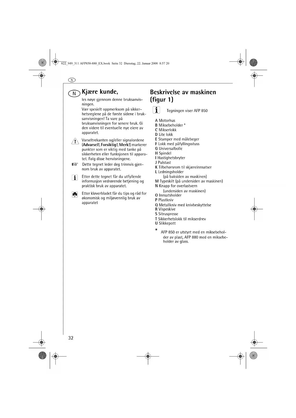 Kjære kunde, les nøye gjennom denne bruksanvis-ningen.Vær spesielt oppmerksom på sikker-hetsreglene på de første sidene i bruk-sanvisningen! Ta vare på bruksanvisningen for senere bruk. Gi den videre til eventuelle nye eiere av apparatet. Varseltrekanten og/eller signalordene (Advarsel!, Forsiktig!, Merk!) markerer punkter som er viktig med tanke på sikkerheten eller funksjonen til appara-tet. Følg disse henvisningene.0 Dette tegnet leder deg trinnvis gjen-nom bruk av apparatet. Etter dette tegnet får du utfyllende informasjon vedrørende betjening og praktisk bruk av apparatet. Etter kløverbladet får du tips og råd for økonomisk og miljøvennlig bruk av apparatet Beskrivelse av maskinen (figur 1) 3 Tegningen viser AFP 850 A MotorhusB Miksebeholder *C MikserlokkD Lite lokkE Stamper med målebegerF Lokk med påfyllingsstussG UniversalbolleH SpindelI HastighetsbryterJ PulstastK Tilbehørsrom til skjæreinnsatserL Ledningsholder (på baksiden av maskinen)M Typeskilt (på undersiden av maskinen)N Knapp for overlastvern (undersiden av maskinen)O InnsatsholderP PlastknivQ Metallkniv med knivbeskyttelseR VispeskiveS SitruspresseT Sikkerhetslokk til mikserdrevU Slikkepott