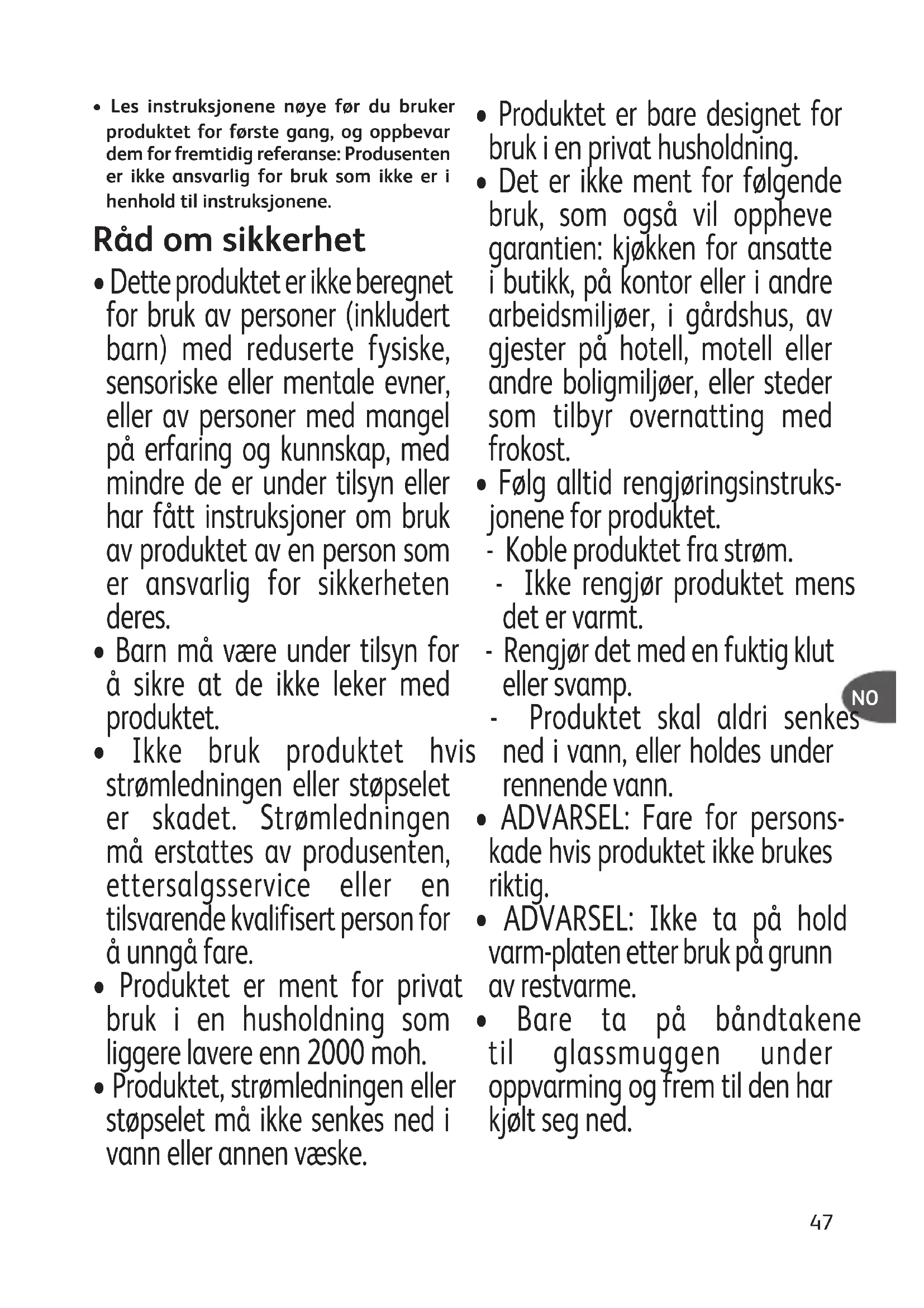 Bare ta på båndtakene til glassmuggen under oppvarming og frem til den har kjølt seg ned. NO• Dette produktet kan brukes av barn som er minst åtte år, forutsatt at de er under oppsyn, at de har fått instruksjoner om sikker bruk av produktet og at de er fullt klar over farene som er involvert. Rengjøring og vedlikehold skal ikke utføres av barn med mindre de er minst åtte år og er under oppsyn av en voksen.