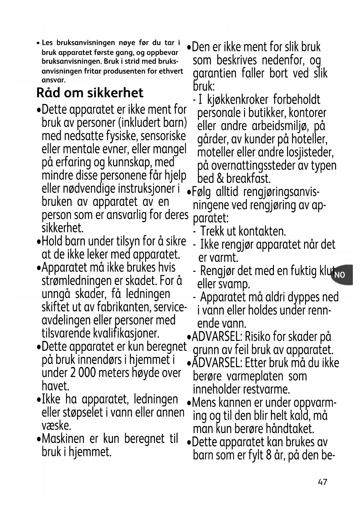 - Dette apparatet kan brukes av barn som er fylt 8 år, på den be- NOtingelse at de er under overvåk- ing og at de har mottatt tilpas- sede instruksjoner om sikker bruk av apparatet, og at de har for- ståelse for eventuelle faremomenter. Rengjøring og vedlikehold som utføres av brukeren, skal ikke utføres av barn med mindre de er minst 8 år og under tilsyn av en voksen person.