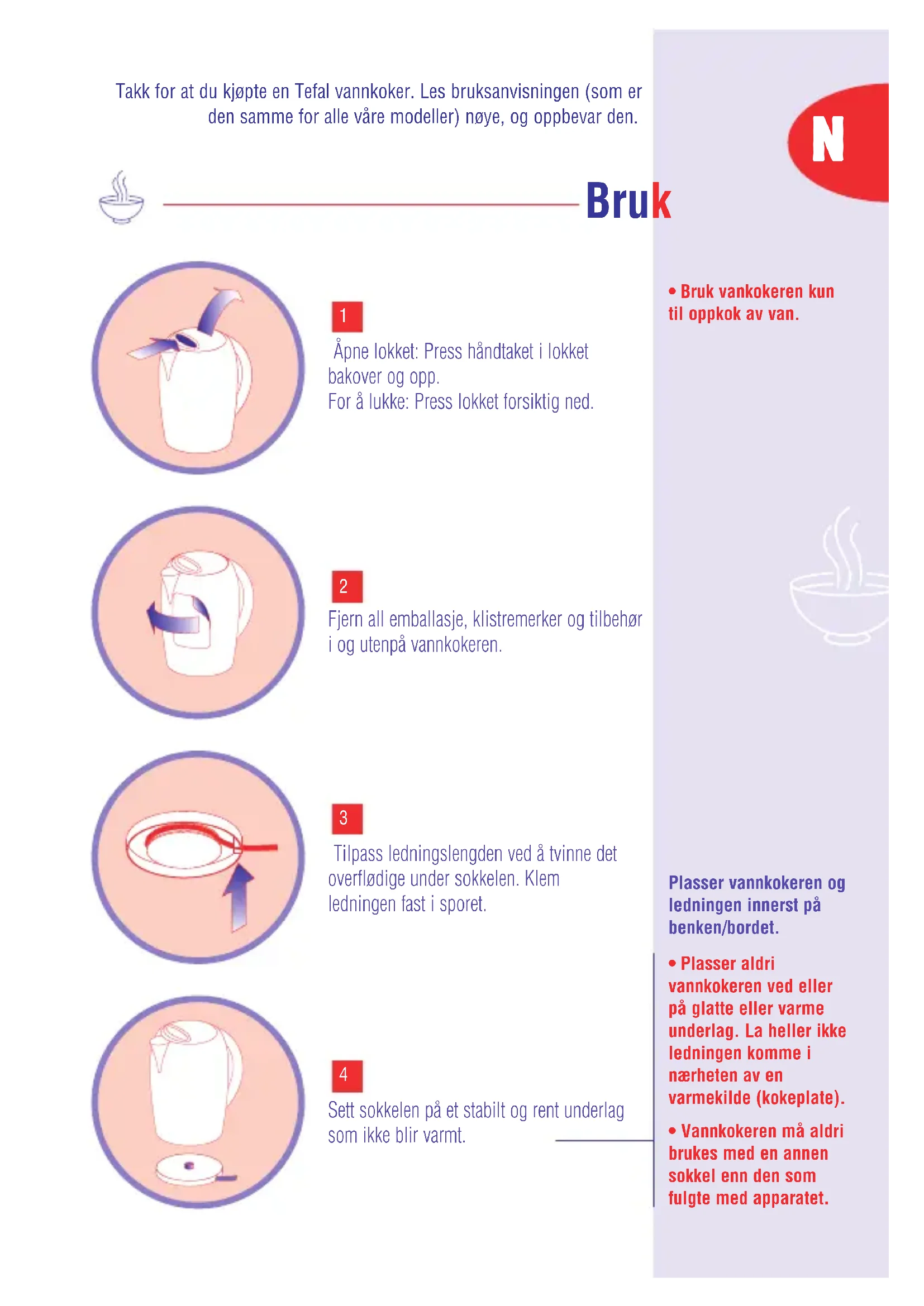 - Bruk vankokeren kun til oppkok av van. Bruk Takk for at du kjøpte en Tefal vannkoker. Les bruksanvisningen (som er den samme for alle våre modeller) nøye, og oppbevar den. NFør vann serveres fra vannkokeren skal du bruke vannkokeren 2-3 ganger, og tømme ut vannet da det kan inneholde støv fra produksjonen. Skyll så vannkokeren og filteret separat. Forsikre deg om at nettspenningen er i samsvar med det som er markert under vannkokeren, og at effekten ikke overskrider det nettet tåler (kun vekselsstrøm).