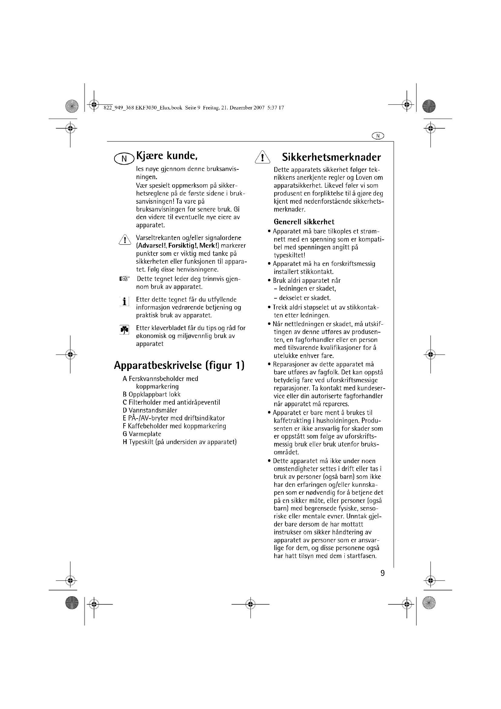 Kjære kunde, les nøye gjennom denne bruksanvis-ningen.Vær spesielt oppmerksom på sikker-hetsreglene på de første sidene i bruk-sanvisningen! Ta vare på bruksanvisningen for senere bruk. Gi den videre til eventuelle nye eiere av apparatet. Varseltrekanten og/eller signalordene (Advarsel!, Forsiktig!, Merk!) markerer punkter som er viktig med tanke på sikkerheten eller funksjonen til appara-tet. Følg disse henvisningene.0 Dette tegnet leder deg trinnvis gjen-nom bruk av apparatet. Etter dette tegnet får du utfyllende informasjon vedrørende betjening og praktisk bruk av apparatet. Etter kløverbladet får du tips og råd for økonomisk og miljøvennlig bruk av apparatet Apparatbeskrivelse (figur 1) A Ferskvannsbeholder med koppmarkeringB Oppklappbart lokkC Filterholder med antidråpeventilD VannstandsmålerE PÅ-/AV-bryter med driftsindikatorF Kaffebeholder med koppmarkeringG VarmeplateH Typeskilt (på undersiden av apparatet) 1 Sikkerhetsmerknader Dette apparatets sikkerhet følger tek-nikkens anerkjente regler og Loven om apparatsikkerhet. Likevel føler vi som produsent en forpliktelse til å gjøre deg kjent med nedenforstående sikkerhets-merknader.Generell sikkerhet• Apparatet må bare tilkoples et strøm-nett med en spenning som er kompati-bel med spenningen angitt på typeskiltet!• Apparatet må ha en forskriftsmessig installert stikkontakt.• Bruk aldri apparatet når– ledningen er skadet,– dekselet er skadet.• Trekk aldri støpselet ut av stikkontak-ten etter ledningen.• Når nettledningen er skadet, må utskif-tingen av denne utføres av produsen-ten, en fagforhandler eller en person med tilsvarende kvalifikasjoner for å utelukke enhver fare.• Reparasjoner av dette apparatet må bare utføres av fagfolk. Det kan oppstå betydelig fare ved uforskriftsmessige reparasjoner. Ta kontakt med kundeser-vice eller din autoriserte fagforhandler når apparatet må repareres.• Apparatet er bare ment å brukes til kaffetrakting i husholdningen. Produ-senten er ikke ansvarlig for skader som er oppstått som følge av uforskrifts-messig bruk eller bruk utenfor bruks-området.• Dette apparatet må ikke under noen omstendigheter settes i drift eller tas i bruk av personer (også barn) som ikke har den erfaringen og/eller kunnska-pen som er nødvendig for å betjene det på en sikker måte, eller personer (også barn) med begrensede fysiske, senso-riske eller mentale evner. Unntak gjel-der bare dersom de har mottatt instrukser om sikker håndtering av apparatet av personer som er ansvar-lige for dem, og disse personene også har hatt tilsyn med dem i startfasen.822_949_368 EKF3030_Elux.book Seite 9 Freitag, 21. Dezember 2007 5:37 17n