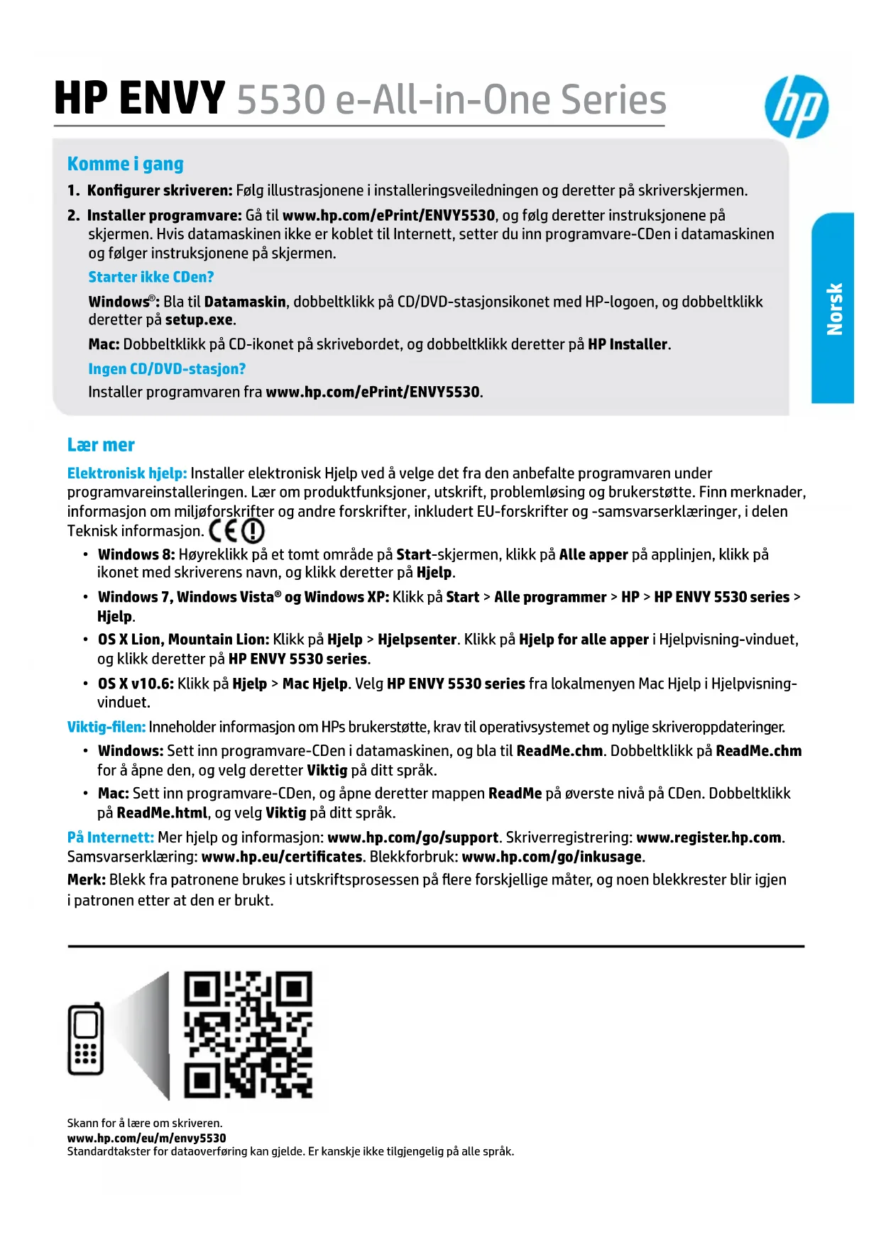 : Bla til Datamaskin, dobbeltklikk på CD/DVD-stasjonsikonet med HP-logoen, og dobbeltklikk deretter på setup.exe. Mac: Dobbeltklikk på CD-ikonet på skrivebordet, og dobbeltklikk deretter på HP Installer. Ingen CD/DVD-stasjon? Installer programvaren fra www.hp.com/ePrint/ENVY5530. Lær mer Elektronisk hjelp: Installer elektronisk Hjelp ved å velge det fra den anbefalte programvaren under programvareinstalleringen. Lær om produktfunksjoner, utskrift, problemløsing og brukerstøtte. Finn merknader, informasjon om miljøforskrifter og andre forskrifter, inkludert EU-forskrifter og -samsvarserklæringer, i delen Teknisk informasjon.