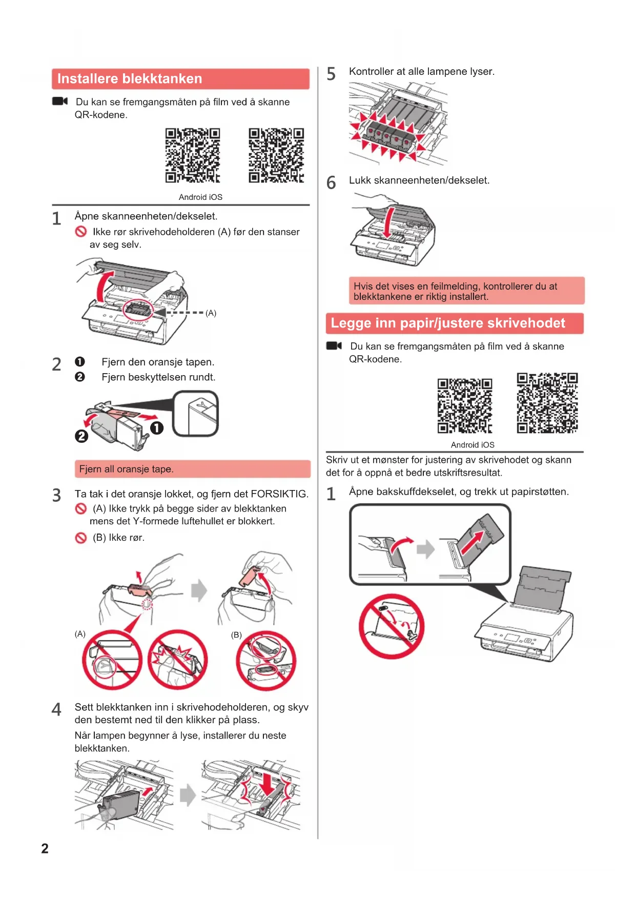 Ta tak i det oransje lokket, og fjern det FORSIKTIG. (A) Ikke trykk på begge sider av blekktanken mens det Y-formede luftehullet er blokkert. (B) Ikke rør. (A) (B)