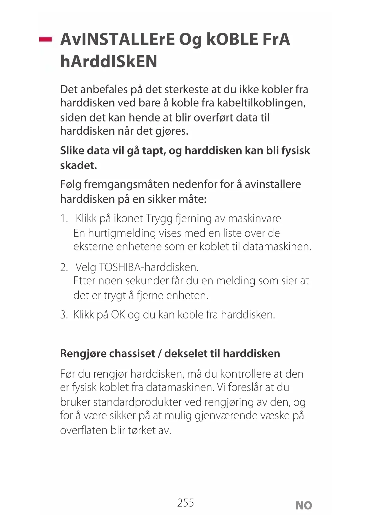 - koble fra kabler mens den er i drift. Avinstaller harddisken først!