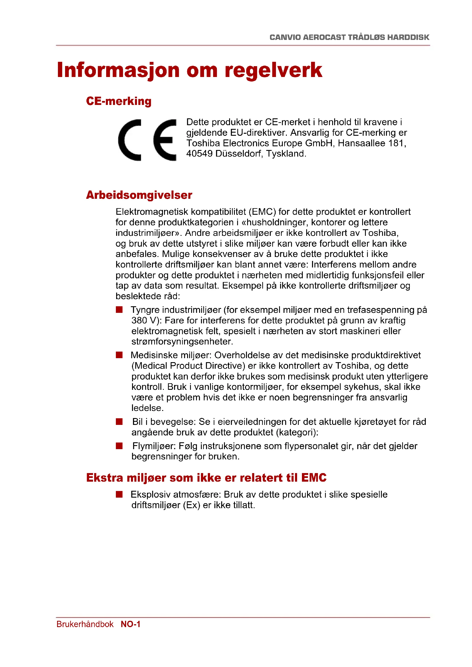 Brukerhåndbok Informasjon om regelverk CE-merking Arbeidsomgivelser Elektromagnetisk kompatibilitet (EMC) for dette produktet er kontrollert for denne produktkategorien i «husholdninger, kontorer og lettere industrimiljøer». Andre arbeidsmiljøer er ikke kontrollert av Toshiba, og bruk av dette utstyret i slike miljøer kan være forbudt eller kan ikke anbefales. Mulige konsekvenser av å bruke dette produktet i ikke kontrollerte driftsmiljøer kan blant annet være: Interferens mellom andre produkter og dette produktet i nærheten med midlertidig funksjonsfeil eller tap av data som resultat. Eksempel på ikke kontrollerte driftsmiljøer og beslektede råd: ■ Tyngre industrimiljøer (for eksempel miljøer med en trefasespenning på 380 V): Fare for interferens for dette produktet på grunn av kraftig elektromagnetisk felt, spesielt i nærheten av stort maskineri eller strømforsyningsenheter. ■ Medisinske miljøer: Overholdelse av det medisinske produktdirektivet (Medical Product Directive) er ikke kontrollert av Toshiba, og dette produktet kan derfor ikke brukes som medisinsk produkt uten ytterligere kontroll. Bruk i vanlige kontormiljøer, for eksempel sykehus, skal ikke være et problem hvis det ikke er noen begrensninger fra ansvarlig ledelse. ■ Bil i bevegelse: Se i eierveiledningen for det aktuelle kjøretøyet for råd angående bruk av dette produktet (kategori): ■ Flymiljøer: Følg instruksjonene som flypersonalet gir, når det gjelder begrensninger for bruken. Ekstra miljøer som ikke er relatert til EMC ■ Eksplosiv atmosfære: Bruk av dette produktet i slike spesielle driftsmiljøer (Ex) er ikke tillatt. Dette produktet er CE-merket i henhold til kravene i gjeldende EU-direktiver. Ansvarlig for CE-merking er Toshiba Electronics Europe GmbH, Hansaallee 181, 40549 Düsseldorf, Tyskland.Brukerhåndbok NO-2
