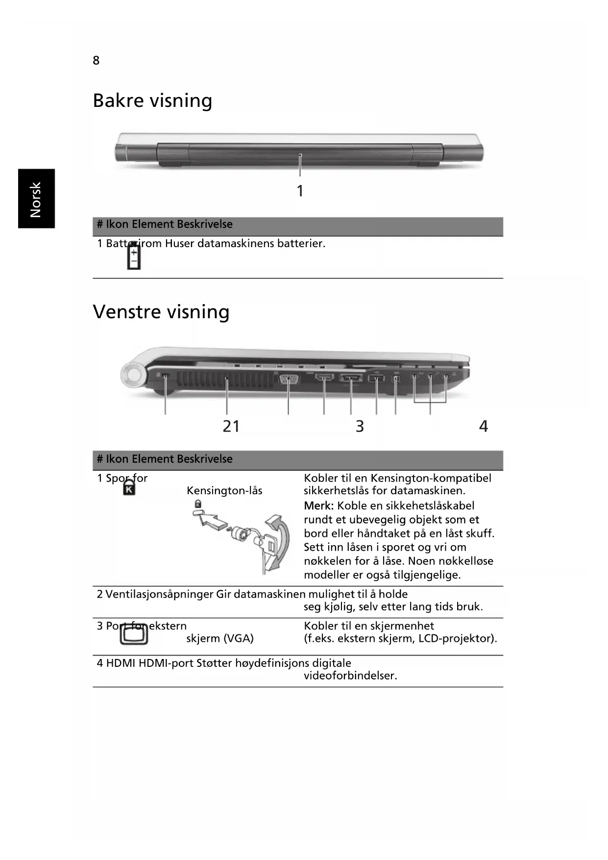 Norsk Bakre visning Venstre visning # Ikon Element Beskrivelse1 Batterirom Huser datamaskinens batterier.# Ikon Element Beskrivelse1 Spor for Kensington-låsKobler til en Kensington-kompatibel sikkerhetslås for datamaskinen.Merk: Koble en sikkehetslåskabel rundt et ubevegelig objekt som et bord eller håndtaket på en låst skuff. Sett inn låsen i sporet og vri om nøkkelen for å låse. Noen nøkkelløse modeller er også tilgjengelige.2 Ventilasjonsåpninger Gir datamaskinen mulighet til å holde seg kjølig, selv etter lang tids bruk.3 Port for ekstern skjerm (VGA)Kobler til en skjermenhet (f.eks. ekstern skjerm, LCD-projektor).4 HDMI HDMI-port Støtter høydefinisjons digitale videoforbindelser.