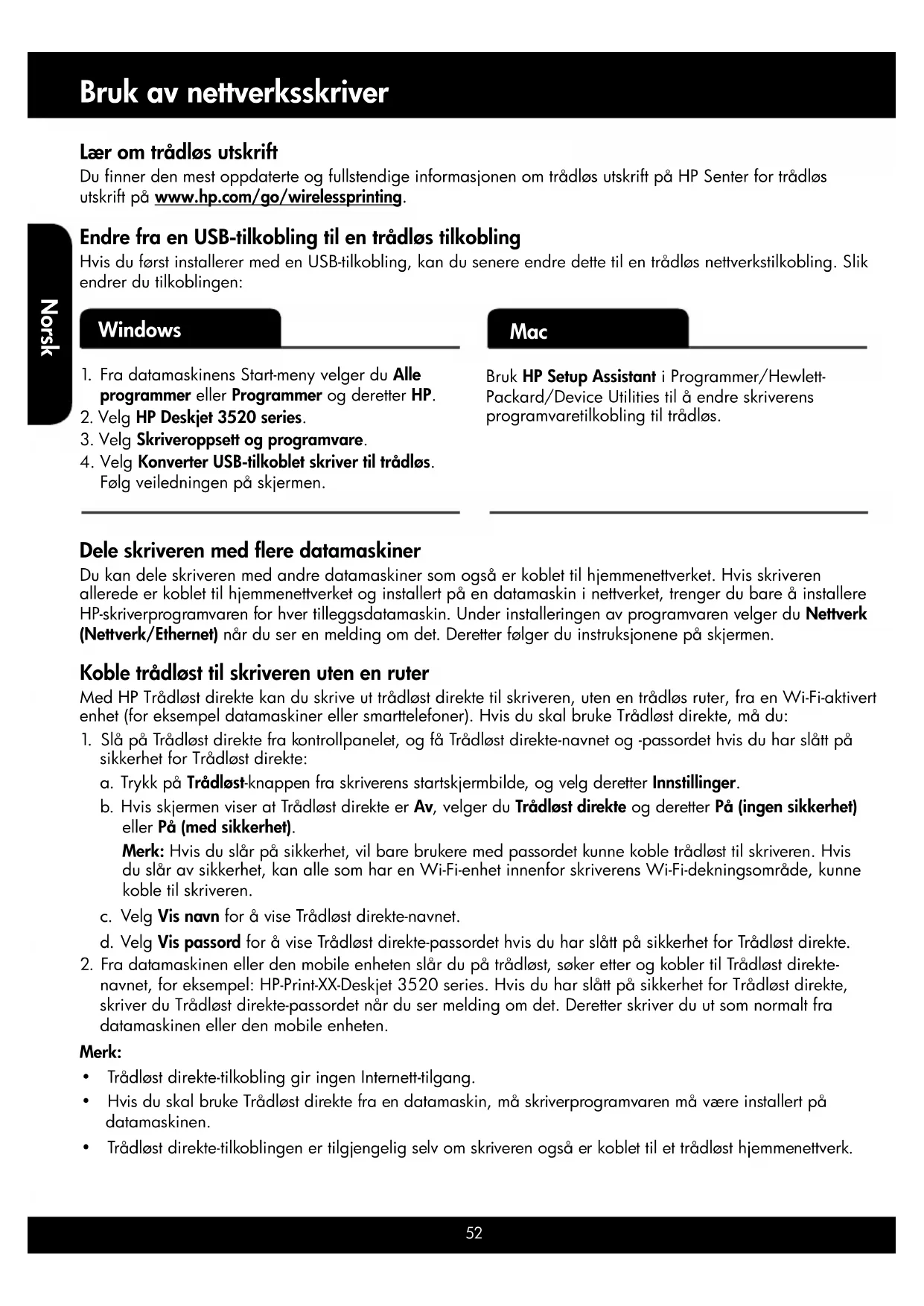 - Trådløst direkte-tilkoblingen er tilgjengelig selv om skriveren også er koblet til et trådløst hjemmenettverk. Norsk53 Løse problemer med nettverksskriver