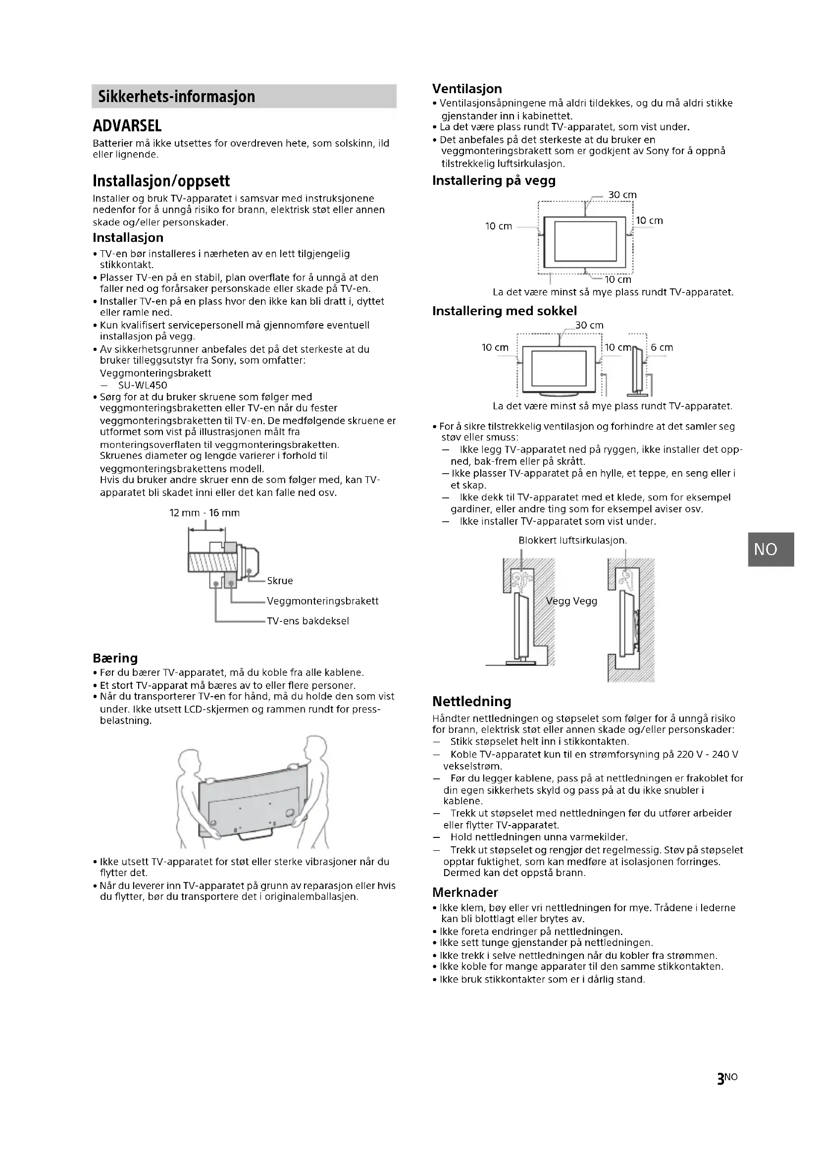 - Av sikkerhetsgrunner anbefales det på det sterkeste at du bruker tilleggsutstyr fra Sony, som omfatter: Veggmonteringsbrakett SU-WL450