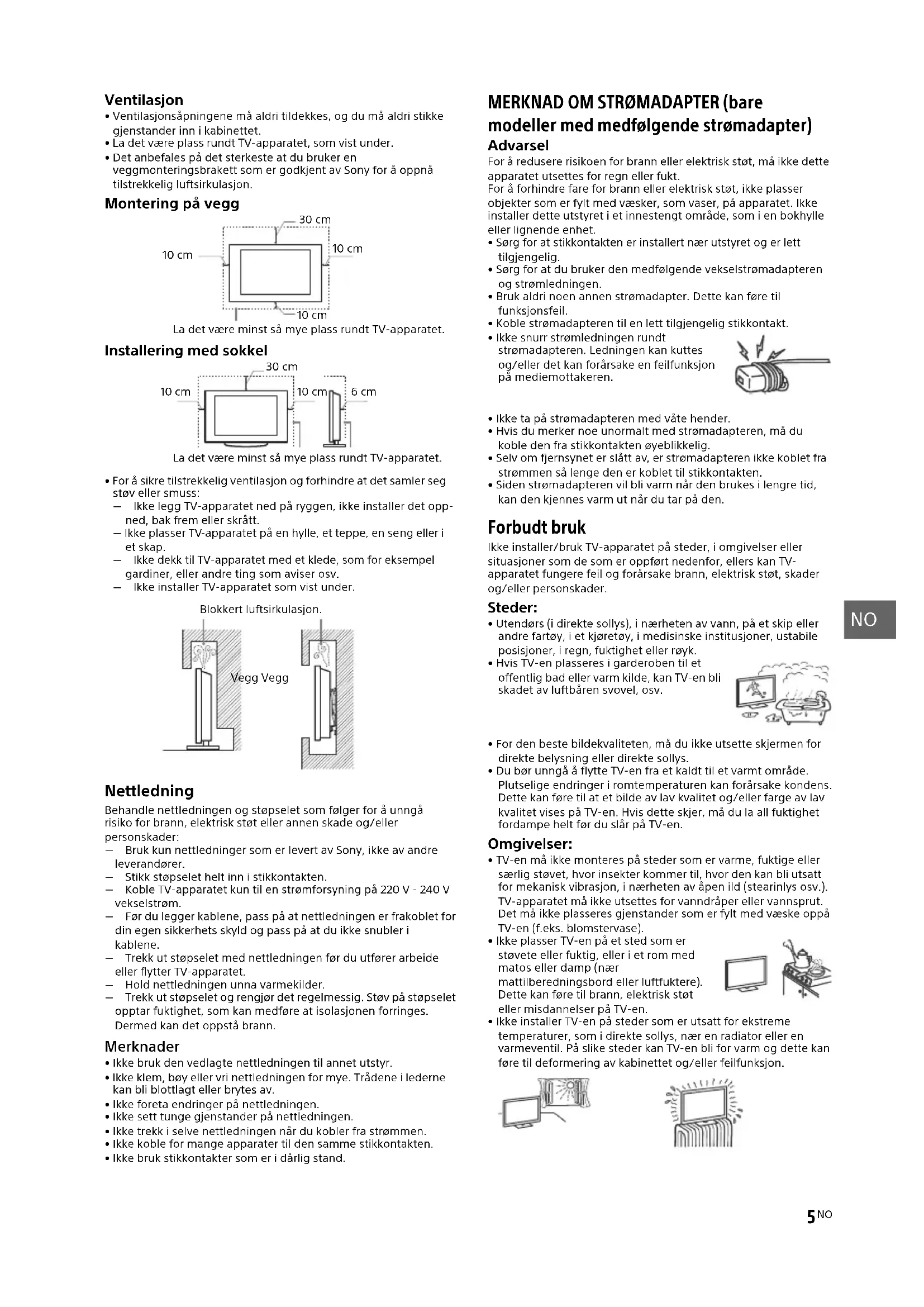 - Siden strømadapteren vil bli varm når den brukes i lengre tid, kan den kjennes varm ut når du tar på den. Forbudt bruk Ikke installer/bruk TV-apparatet på steder, i omgivelser eller situasjoner som de som er oppført nedenfor, ellers kan TV- apparatet fungere feil og forårsake brann, elektrisk støt, skader og/eller personskader. Steder: