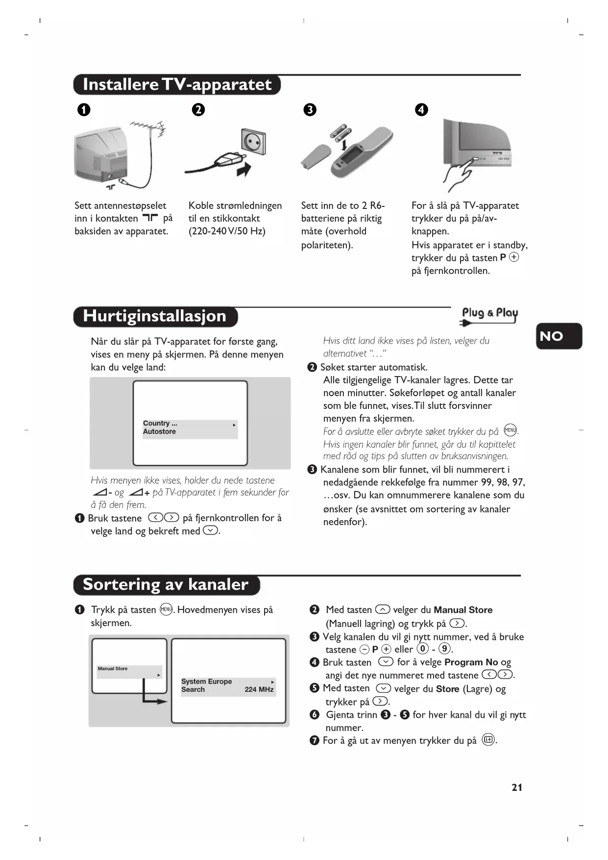 Hvis ingen kanaler blir funnet, går du til kapittelet med råd og tips på slutten av bruksanvisningen. “ Kanalene som blir funnet, vil bli nummerert i nedadgående rekkefølge fra nummer 99, 98, 97, …osv. Du kan omnummerere kanalene som du ønsker (se avsnittet om sortering av kanaler nedenfor). & Tr ykk på tasten H.Hovedmenyen vises på skjermen. é Med tasten î velger du Manual Store (Manuell lagring) og trykk på ¬. “ Velg kanalen du vil gi nytt nummer, ved å bruke tastene @ P # eller 0 - 9. ‘ Bruk tasten Ï for å velge Program No og angi det nye nummeret med tastene Ȭ. ( Med tasten Ï velger du Store (Lagre) og trykker på