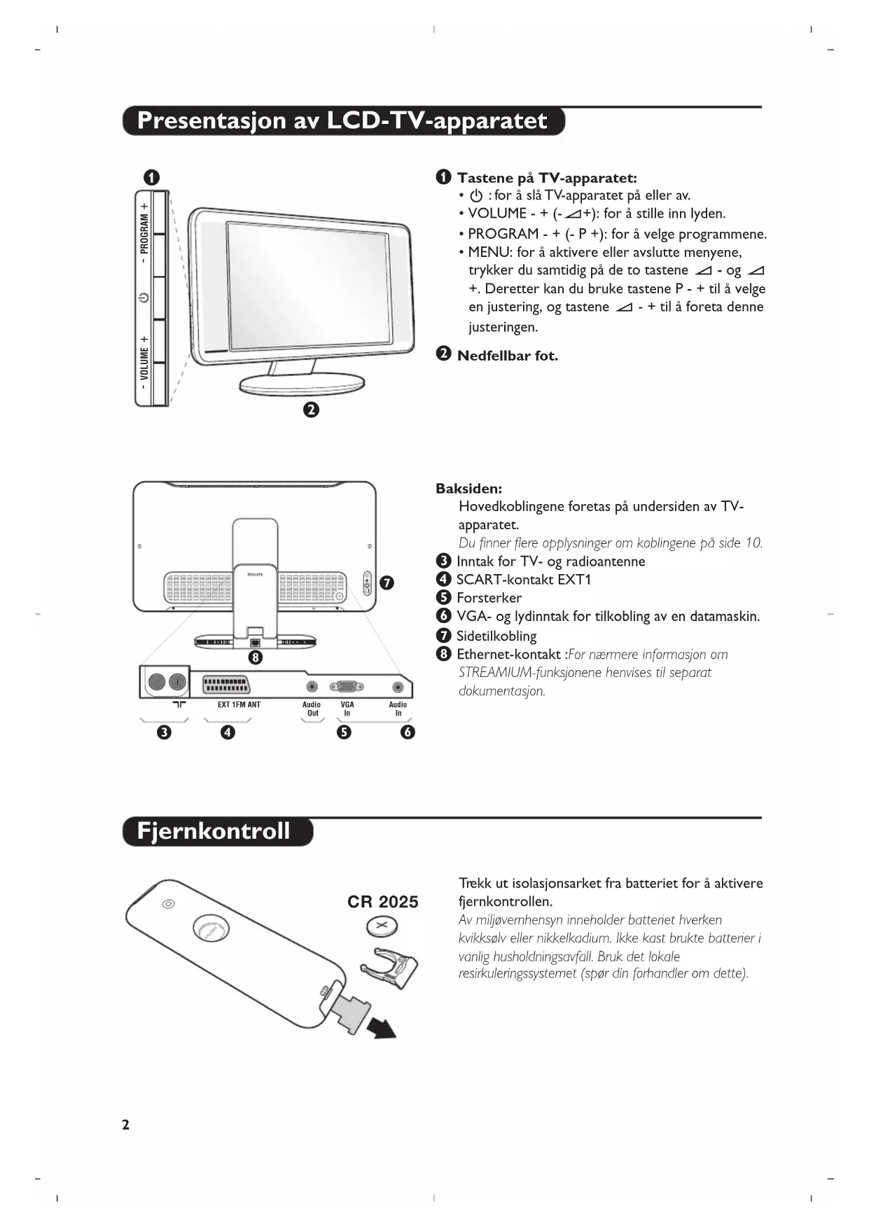 Nedfellbar fot. Baksiden: Hovedkoblingene foretas på undersiden av TV- apparatet. Du finner flere opplysninger om koblingene på side 10. “ Inntak for TV- og radioantenne ‘ SCART-kontakt EXT1 ( Forsterker § VGA- og lydinntak for tilkobling av en datamaskin. è Sidetilkobling ! Ethernet-kontakt :For nærmere informasjon om STREAMIUM-funksjonene henvises til separat dokumentasjon. Trekk ut isolasjonsarket fra batteriet for å aktivere fjernkontrollen. Av miljøvernhensyn inneholder batteriet hverken kvikksølv eller nikkelkadium. Ikke kast brukte batterier i vanlig husholdningsavfall. Bruk det lokale resirkuleringssystemet (spør din forhandler om dette). CR 20253 Tastene på fjernkontrollen Tekst-TV-taster (se side 8) Valg av EXT-kontakter (s.10) Tr ykk flere ganger for å velge det tilkoblede apparatet. Lydmodus Gjør det mulig å veksle fra Stereo og Nicam Stereo til Mono eller, for tospråklige programmer, velge mellom Dual I og Dual II. Mono-indikatoren lyser rødt når Mono er valgt manuelt. tast som ikke brukes. TV / PC / Radio Tr ykk på disse tastene for å veksle mellom TV-, PC- og radiomodus (s. 9). Markør (OPP/NED/ VENSTRE/HØYRE)
