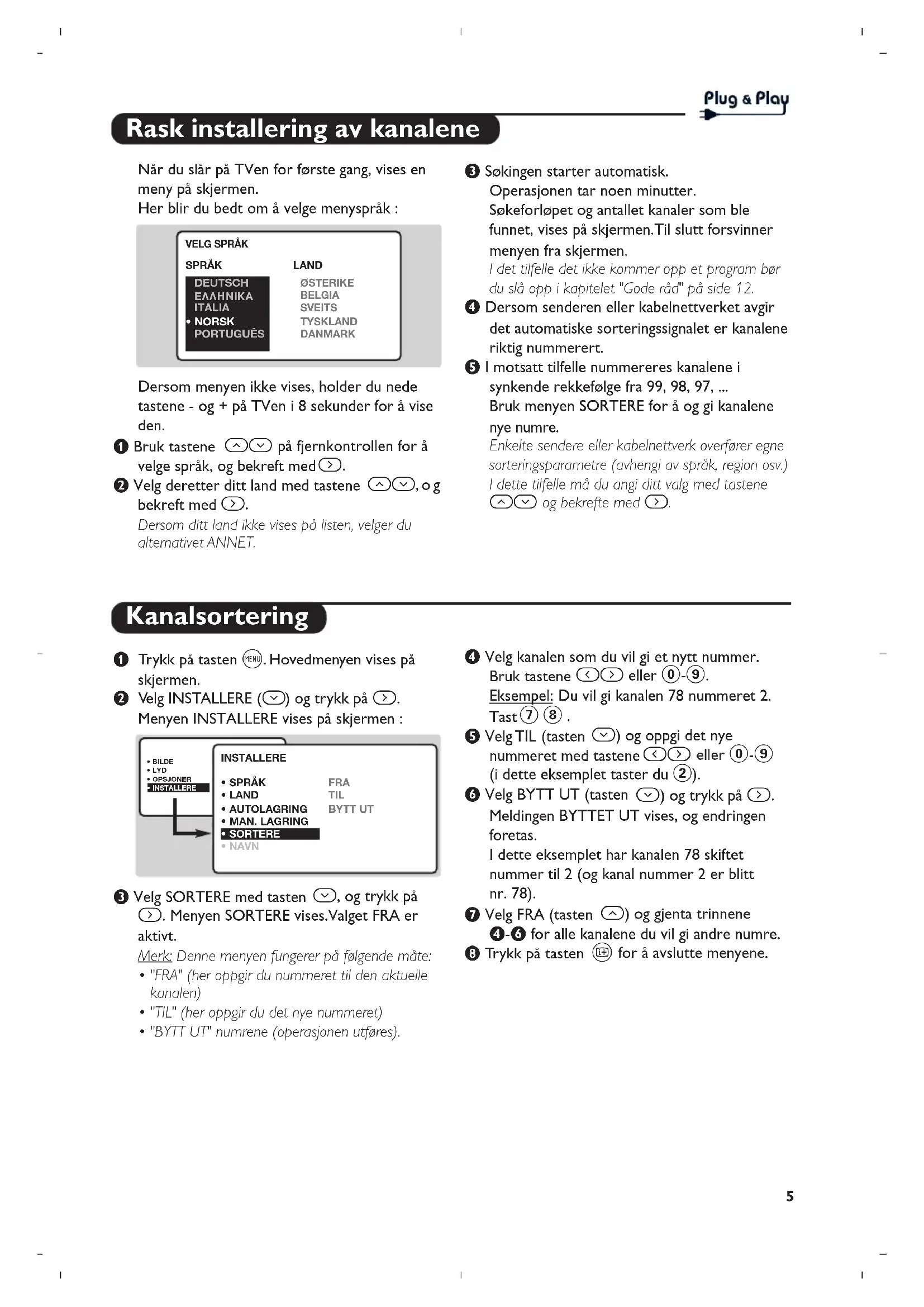 - NAVN ZDF_ Valg av språk og land Automatisk lagring & Tr ykk på tasten H for å vise hovedmenyen. é Velg INSTALLERE ( Ï) og trykk på ¬.Menyen INSTALLERE vises.Valget SPRÅK er aktivt. “ Tr ykk på ¬ for å vise menyen SPRÅK. ‘ Velg ditt språk med tastene îÏ. Menyene vises på det valgte språket. ( Tr ykk på È for å avslutte menyen SPRÅK. § Velg LAND ( Ï) og trykk på ¬. è Velg ditt land med tastene îÏ. Dersom ditt land ikke vises på listen, velger du alternativet ANNET. ! Tr ykk på È for å avslutte menyen LAND. ç Tr ykk på d for å avslutte menyene. Denne menyen gjør det mulig å starte automatisk søking etter samtlige kanaler som er tilgjengelige i ditt område (eller på ditt kabelnett). & Utfør først operasjonene &-! ovenfor, og deretter: é Velg AUTOLAGRING ( Ï) og trykk på ¬. Søkingen begynner. Etter noen minutter vises menyen INSTALLERE automatisk på nytt. “ Dersom senderen eller kabelnettverket avgir det automatiske sorteringssignalet er kanalene riktig nummerert. ‘ I motsatt tilfelle nummereres kanalene i synkende rekkefølge fra 99, 98, 97... Bruk menyen SORTERE for å og gi kanalene nye numre. Enkelte sendere eller kabelnettverk overfører egne sorteringsparametre (avhengi av språk, region osv.) I dette tilfelle må du angi ditt valg med tastene îÏ og bekrefte med ¬. For å avslutte eller avbryte søkingen trykker du på tasten H. Dersom du ikke finner noe bilde, går du til kapitlet "Gode råd" på side 12. ( Tr ykk på d for å avslutte menyene.