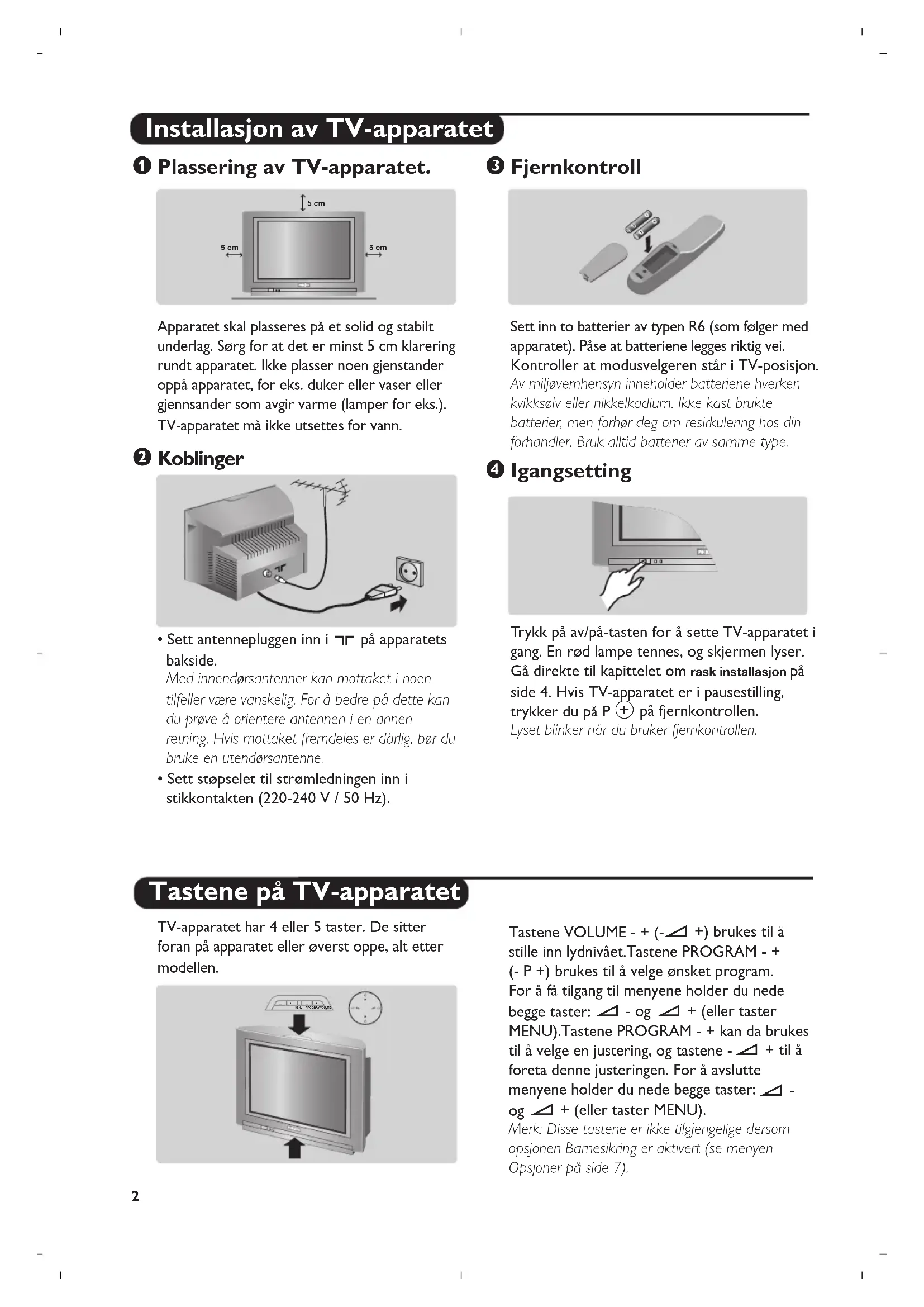 Noen ord om resirkulering Materialene i ditt TV-apparat kan enten gjennbrukes eller gjennvinnes. Det finnes spesialfirmaer som samler opp brukte apparater, demonterer dem og sorterer de ulike delene som kan resirkuleres. Forhør deg hos din forhandler. NorskTV-apparatet har 4 eller 5 taster. De sitter foran på apparatet eller øverst oppe, alt etter modellen. Tastene VOLUME - + (- ” +) brukes til å stille inn lydnivået.Tastene PROGRAM - + (- P +) brukes til å velge ønsket program. For å få tilgang til menyene holder du nede begge taster: ” - og ” + (eller taster MENU).Tastene PROGRAM - + kan da brukes til å velge en justering, og tastene - ” + til å foreta denne justeringen. For å avslutte menyene holder du nede begge taster: