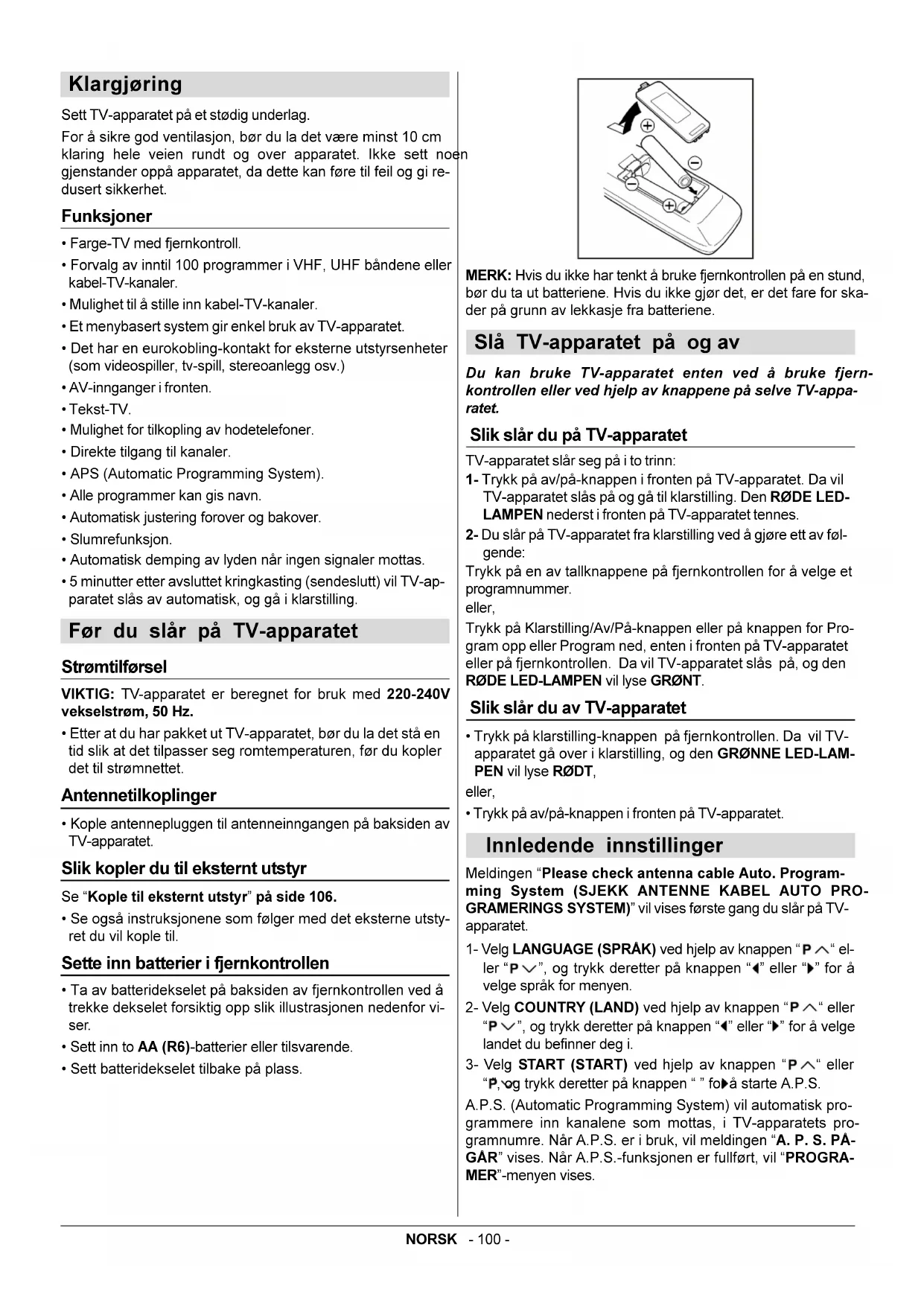 Lyn-symbolet som endrer i en pilspiss, i en likesidet trekant, er ment som et varsel til brukeren om fare for ikke isolert, farlig høyspenning inne i apparatet. Denne spenningen er høy nok til å føre til personskade. Utropstegnet inne i en likesidet trekant er ment som et varsel til brukeren om at bruksanvisningen og instruksjoner for vedlikehold og service som følger med apparatet, inneholder viktige instruksjoner som må følges.NORSK - 99 - Knapper på kontrollpanelet Antennetilkoplinger AV14BM8ENS AV14BJ8ENSNORSK - 100 - Klargjøring Sett TV-apparatet på et stødig underlag. For å sikre god ventilasjon, bør du la det være minst 10 cm klaring hele veien rundt og over apparatet. Ikke sett noen gjenstander oppå apparatet, da dette kan føre til feil og gi re- dusert sikkerhet. Funksjoner Farge-TV med fjernkontroll. Forvalg av inntil 100 programmer i VHF, UHF båndene eller kabel-TV-kanaler. Mulighet til å stille inn kabel-TV-kanaler. Et menybasert system gir enkel bruk av TV-apparatet. Det har en eurokobling-kontakt for eksterne utstyrsenheter (som videospiller, tv-spill, stereoanlegg osv.) AV-innganger i fronten. Tekst-TV. Mulighet for tilkopling av hodetelefoner. Direkte tilgang til kanaler. APS (Automatic Programming System). Alle programmer kan gis navn. Automatisk justering forover og bakover. Slumrefunksjon. Automatisk demping av lyden når ingen signaler mottas. 5 minutter etter avsluttet kringkasting (sendeslutt) vil TV-ap- paratet slås av automatisk, og gå i klarstilling. Før du slår på TV-apparatet Strømtilførsel VIKTIG: TV-apparatet er beregnet for bruk med 220-240V vekselstrøm, 50 Hz. Etter at du har pakket ut TV-apparatet, bør du la det stå en tid slik at det tilpasser seg romtemperaturen, før du kopler det til strømnettet. Antennetilkoplinger Kople antennepluggen til antenneinngangen på baksiden av TV-apparatet. Slik kopler du til eksternt utstyr Se Kople til eksternt utstyr på side 106. Se også instruksjonene som følger med det eksterne utsty- ret du vil kople til. Sette inn batterier i fjernkontrollen Ta av batteridekselet på baksiden av fjernkontrollen ved å trekke dekselet forsiktig opp slik illustrasjonen nedenfor vi- ser. Sett inn to AA (R6)-batterier eller tilsvarende. Sett batteridekselet tilbake på plass. MERK: Hvis du ikke har tenkt å bruke fjernkontrollen på en stund, bør du ta ut batteriene. Hvis du ikke gjør det, er det fare for ska- der på grunn av lekkasje fra batteriene. Slå TV-apparatet på og av Du kan bruke TV-apparatet enten ved å bruke fjern- kontrollen eller ved hjelp av knappene på selve TV-appa- ratet. Slik slår du på TV-apparatet TV-apparatet slår seg på i to trinn: