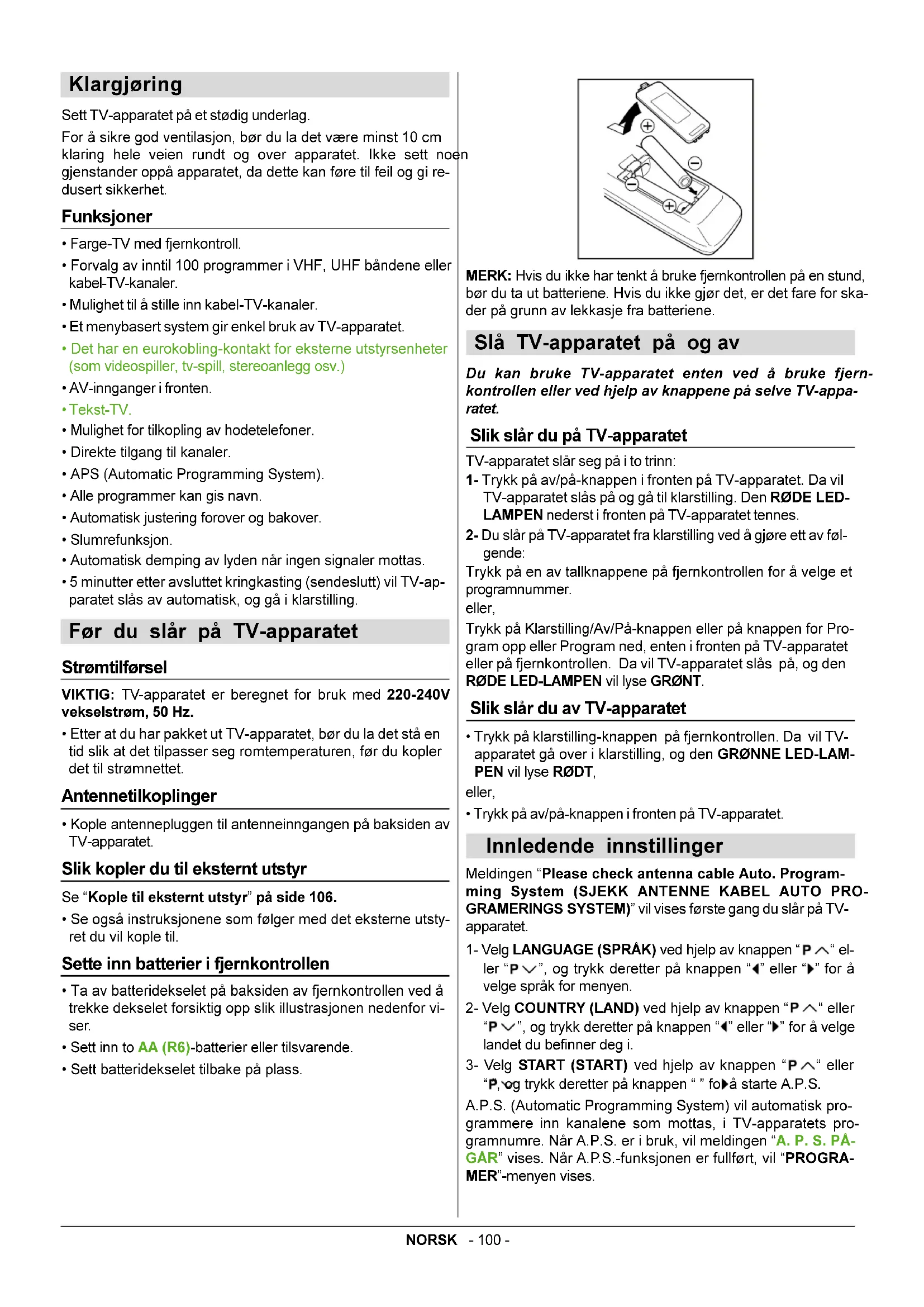 Lyn-symbolet som endrer i en pilspiss, i en likesidet trekant, er ment som et varsel til brukeren om fare for ikke isolert, farlig høyspenning inne i apparatet. Denne spenningen er høy nok til å føre til personskade. Utropstegnet inne i en likesidet trekant er ment som et varsel til brukeren om at bruksanvisningen og instruksjoner for vedlikehold og service som følger med apparatet, inneholder viktige instruksjoner som må følges.NORSK - 99 - Knapper på kontrollpanelet AntennetilkoplingerNORSK - 100 - Klargjøring Sett TV-apparatet på et stødig underlag. For å sikre god ventilasjon, bør du la det være minst 10 cm klaring hele veien rundt og over apparatet. Ikke sett noen gjenstander oppå apparatet, da dette kan føre til feil og gi re- dusert sikkerhet. Funksjoner Farge-TV med fjernkontroll. Forvalg av inntil 100 programmer i VHF, UHF båndene eller kabel-TV-kanaler. Mulighet til å stille inn kabel-TV-kanaler. Et menybasert system gir enkel bruk av TV-apparatet. Det har en eurokobling-kontakt for eksterne utstyrsenheter (som videospiller, tv-spill, stereoanlegg osv.) AV-innganger i fronten. Tekst-TV. Mulighet for tilkopling av hodetelefoner. Direkte tilgang til kanaler. APS (Automatic Programming System). Alle programmer kan gis navn. Automatisk justering forover og bakover. Slumrefunksjon. Automatisk demping av lyden når ingen signaler mottas. 5 minutter etter avsluttet kringkasting (sendeslutt) vil TV-ap- paratet slås av automatisk, og gå i klarstilling. Før du slår på TV-apparatet Strømtilførsel VIKTIG: TV-apparatet er beregnet for bruk med 220-240V vekselstrøm, 50 Hz. Etter at du har pakket ut TV-apparatet, bør du la det stå en tid slik at det tilpasser seg romtemperaturen, før du kopler det til strømnettet. Antennetilkoplinger Kople antennepluggen til antenneinngangen på baksiden av TV-apparatet. Slik kopler du til eksternt utstyr Se Kople til eksternt utstyr på side 106. Se også instruksjonene som følger med det eksterne utsty- ret du vil kople til. Sette inn batterier i fjernkontrollen Ta av batteridekselet på baksiden av fjernkontrollen ved å trekke dekselet forsiktig opp slik illustrasjonen nedenfor vi- ser. Sett inn to AA (R6)-batterier eller tilsvarende. Sett batteridekselet tilbake på plass. MERK: Hvis du ikke har tenkt å bruke fjernkontrollen på en stund, bør du ta ut batteriene. Hvis du ikke gjør det, er det fare for ska- der på grunn av lekkasje fra batteriene. Slå TV-apparatet på og av Du kan bruke TV-apparatet enten ved å bruke fjern- kontrollen eller ved hjelp av knappene på selve TV-appa- ratet. Slik slår du på TV-apparatet TV-apparatet slår seg på i to trinn:
