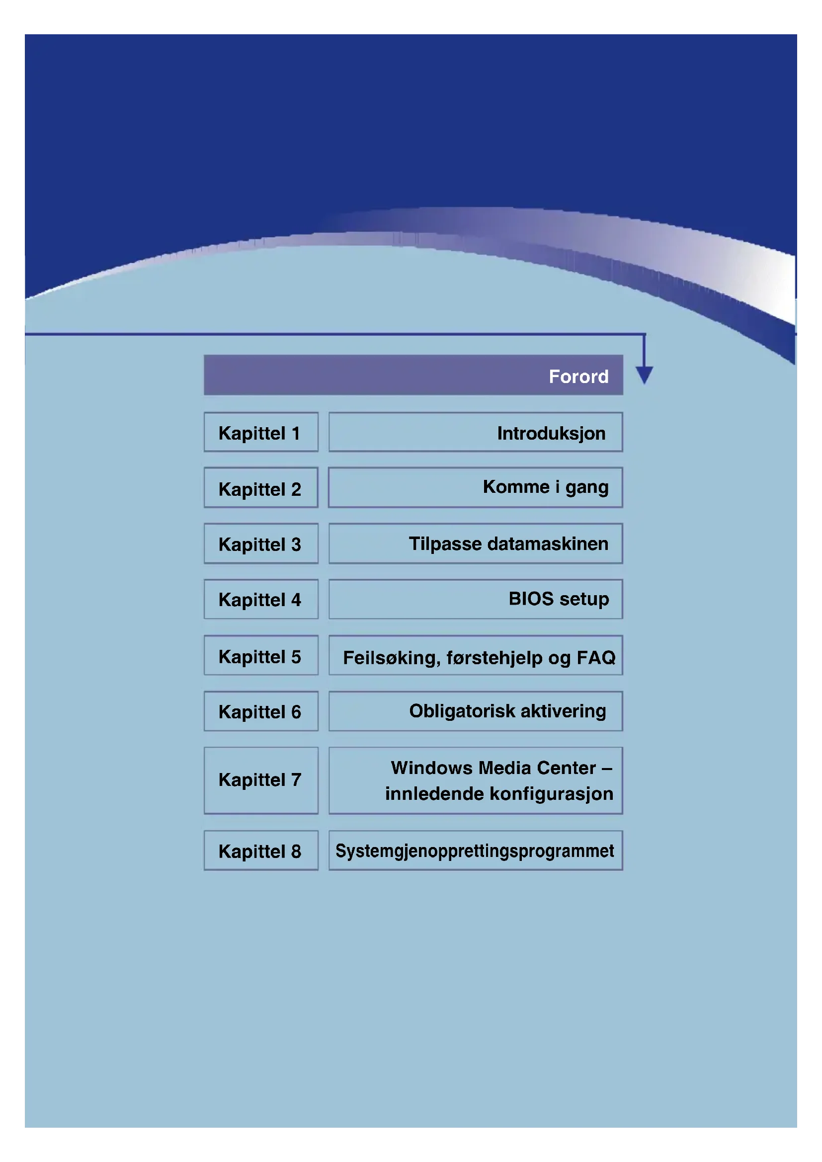 ForordKapittel 1 Kapittel 2 Kapittel 3 Kapittel 4 Kapittel 5 Kapittel 6 Kapittel 7 Kapittel 8 Forord Introduksjon Komme i gang Tilpasse datamaskinen BIOS setup Feilsøking, førstehjelp og FAQ Obligatorisk aktivering Windows Media Center – innledende konfigurasjon Systemgjenopprettingsprogrammet1-2 Introduksjon Først vil vi gratulere deg med kjøpet av en kraftig og velkonstruert bærbar datamaskin, som vi håper vil kunne gi deg en behagelig og profesjonell brukeropplevelse. Vi er stolt over å kunne fortelle våre kunder at maskinen har gjennomgått svært grundige tester. Vårt rykte for uforlignelig pålitelighet og tilfredse kunder er produktets beste garanti. Hvordan bruke håndboken Denne brukerhåndboken inneholder instruksjoner og illustrasjoner som viser deg hvordan du skal bruke datamaskinen. Vi anbefaler at du leser håndboken nøye før du tar datamaskinen i bruk. Kapittel 1, Generell introduksjon, inkluderer beskrivelse av alt tilleggsutstyret til datamaskinen. Det anbefales at du kontrollerer at alt tilleggsutstyret er på plass når du åpner pakken. Hvis noen av gjenstandene er ødelagt eller mangler, vennligst kontakt forhandleren hvor du kjøpte den bærbare datamaskinen. Kapittel 2, Komme i gang, gir deg datamaskinens spesifikasjoner og introduserer funksjonstastene, hurtigtastene, kontaktene, lampene og annet utstyr. Dette kapittelet forklarer også korrekte fremgangsmåten for å ta ut eller sette inn batteri, og noen korte forslag til hvordan datamaskinen kan brukes.1-3 Introduksjon Kapittel 3, Tilpassing datamaskinen , gir deg instruksjoner om hvordan du kan kople til mus, tastatur, webkamera, skriver, ekstern skjerm, IEEE 1394 enheter og kommunikasjonsutstyr. Du vil også få vite hvordan man installerer og fjerner PC-kort. Kapittel 4, BIOS setup, gir informasjon om bruk av BIOS setup programmet, og hvordan du kan konfigurere systemet optimalt.1-4 Introduksjon Pakke ut Først pakker du ut av esken og sjekker alle delene nøye. Hvis en del er skadet eller mangler, må du umiddelbart kontakt med din lokale forhandler. Ta også vare på esken og innpakningsmaterialet, i tilfellet du må sende maskinen på et senere tidspunkt.Kapittel 1 Kapittel 2 Kapittel 3 Kapittel 4 Kapittel 5 Kapittel 6 Kapittel 7 Kapittel 8 Forord Introduksjon Komme i gang Tilpasse datamaskinen BIOS setup Feilsøking, førstehjelp og FAQ Obligatorisk aktivering Windows Media Center – innledende konfigurasjon Systemgjenopprettingsprogrammet2-2 Komme i gang Spesifikasjoner Fysikalsk karakteristikk Dimensjoner 358 (V) x 259 (D) x 27~33 (H) mm Vekt 2.6 kg (med 6 cellebatterier) CPU Prosessortype Bøssing S1 (638-pin, ìPGA) Støtteprosessor Turion 64 bit Taylor prosessor, dual core 35W (versjon F/G) L1 hurtigbuffer 64KB L2 hurtigbuffer 512k/1M FSB hastighet 800MHz Kjerne chips North Bridge nVidia C51MV (GeForce Go 6100) South Bridge nVidia MCP51M (nForce Go 430) Minne Teknologi DDRII 533/ 667 Minne DDRII SO-DIMM X 2 slisset