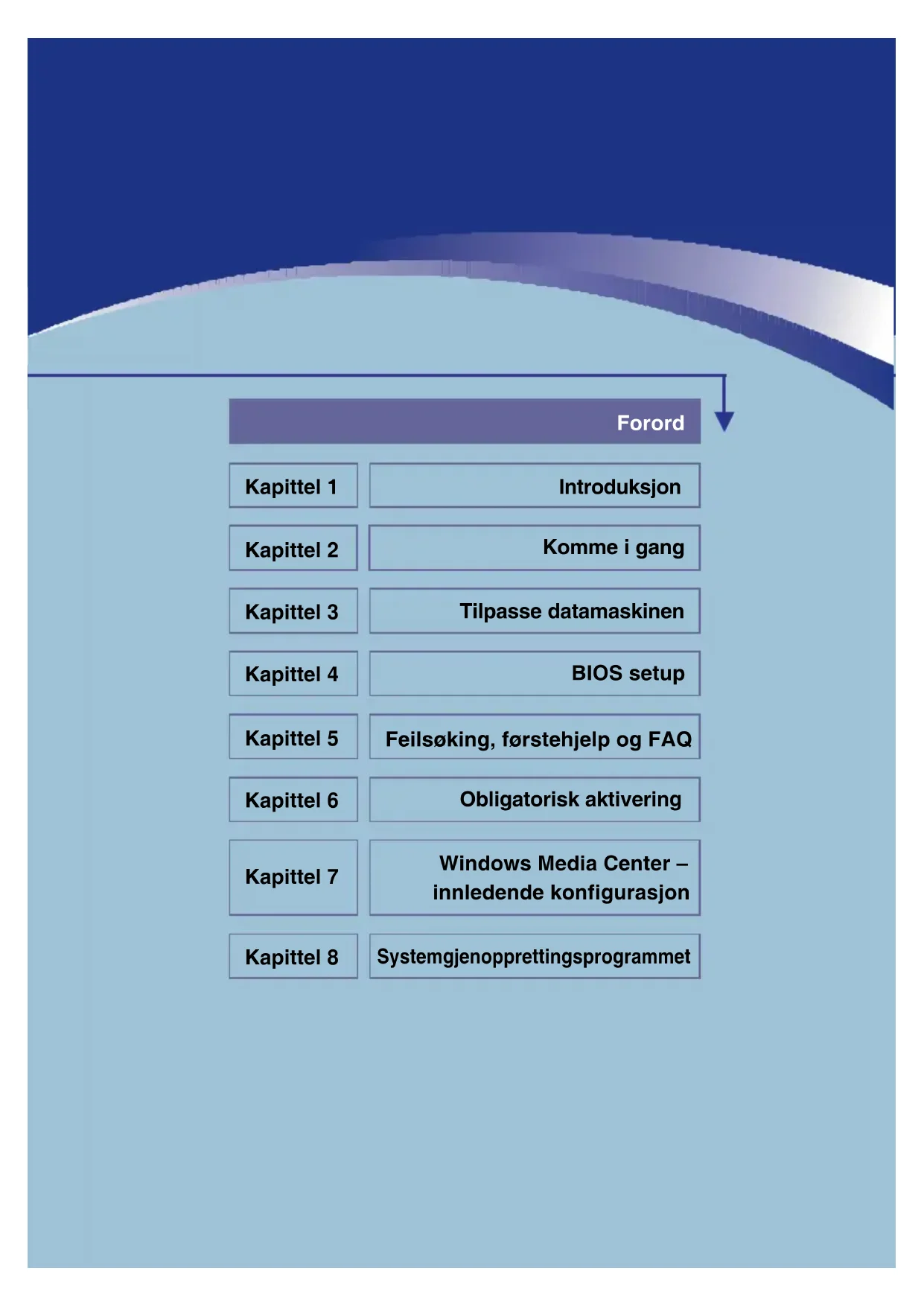 Exit & lagre endringer Lagre endringene du har utført og gå ut fra serviceprogrammet. Exit & forkast endringer Gå ut fra serviceprogrammet uten å lagre endringene. Forkast endringer Forlat endringene og last siste konfigurasjon igjen, før du kjører serviceprogrammet. Last setup standard Velg denne posten for å laste standardinnstillingene for en optimal systemutførelse.Kapittel 1 Kapittel 2 Kapittel 3 Kapittel 4 Kapittel 5 Kapittel 6 Kapittel 7 Kapittel 8 Forord Introduksjon Komme i gang Tilpasse datamaskinen BIOS setup Feilsøking, førstehjelp og FAQ Obligatorisk aktivering Windows Media Center – innledende konfigurasjon Systemgjenopprettingsprogrammet5-2 Notebook Feilsøking, førstehjelp og FAQ (vanlige spørsmål) Denne bærbare datamaskinen har gjennomgått omfattende testing, er av høy kvalitet og utstyrt med den aller nyeste teknologien. Likevel kan det fra tid til annen oppstå problemer eller feil ved maskinen. For at du skal kunne bli i stand til selv å gjenopprette systemet når dette skjer, har vi samlet informasjon om hvordan du identifiserer og løser de mest vanlige problemene. Hvis du støter på problemer, gjør du som følger: MERK Du finner de siste FAQ på skrivebordet under Produsentens opplysninger og på Internett. Gå til http://www.service.targa.co.uk for å søke etter de siste FAQ og nyeste drivere. - Les kapitlet som omhandler det samme i denne håndboken. - Bruk Windows Systemgjenoppretting - Hvis datamaskinen ikke starter på nytt eller det oppstår feil i oppstartprosessen, bruker du gjenopprettingsprogrammet på EasyInstall-CDen. Denne programvaren vil hjelpe deg til å gjenopprette Windows sine oppstarts- og systemfiler. Du vil også kunne tilbakestille datamaskinens konfigurasjon til fabrikkstandard, om nødvendig.5-3 Notebook Feilsøking Hvis datamaskinen henger seg mens den kjører eller starter opp på nytt, kan det være på grunn av nylig installert programvare. Dette kan løses på følgende måte: - Slå på datamaskinen. Først av alt vil du se de vanlige BIOS-meldingene. Så snart disse er ferdige, trykk på [F8]-tasten. Dette vil få opp Windows XPs oppstartmeny. Velg alternativet Sikkerhetsmodus. Windows vil nå starte i en spesiell ”førstehjelpsmodus.” - Klikk på Start/Alle programmer/Tilbehør/Systemverktøy/Systemgjenoppretting for å tilbakestille maskinen til et tidspunkt der den fungerte. Hvis ikke dette hjelper, kan du prøve de andre gjenopprettingsalternativene. - Avinstaller den sist installerte programvaren via alternativet Legg til eller fjern programmer under Kontrollpanel (dette fungerer også i sikkermodus). - Start datamaskinen mens Windows XP Home Edition-CD-en sitter i stasjonen og hold en bokstavtast (f.eks. [H]) nede til Windows Setup starter. Vent til alle filene er lastet inn. I velkomstvinduet til Windows trykker du på [Enter], bekrefter Lisensavtalen for sluttbrukere ved å trykke [F8] og trykker [R] for å reparere en installasjon. (Når Windows er reparert, trenger du bare å installere driverne fra EasyInstall-CD-en én gang på nytt.) - Ta kontakt med produsenten av tredjepartsprogramvaren.5-4 Notebook Hvis du ikke hører noen lyd, kan det skyldes feil både i maskinvaren og programvaren. Følg punktene nedenfor for å prøve å finne feilen: - Kontroller at driveren til lydkortet er installert og at du har valgt lydkortet som standard lydenhet. Det gjør du ved å åpne kontrollpanelet og dobbeltklikke på Lyder og lydenheter, klikk på kategorien Lyd og kontroller at Realtek Lyd er valgt som standard lydinnspillings- og lydavspillingsenhet. - Mens du er inne på standardenheten for lydavspilling, klikker du på Volum-knappen og kontrollerer at det ikke er merket av for noen av Demp-alternativene. Dra alle volumkontrollene til middels volumnivå. - Installer lyddriveren fra EasyInstall-CD-en på nytt. - Ta kontakt med vår brukerstøttetelefon. Hvis du ikke får koblet deg opp til Internett via et modem, kan det være flere grunner til dette. Følg disse trinnene for å finne feilen: - Avinstaller modemet ved å åpne Enhetsbehandling under Kontrollpanel/System/Maskinvare. Klikk på pluss-tegnet utenfor Modemer, høyreklikk på modemet og velg Avinstaller. Modemet vil bli fjernet fra listen. Nå kan du foreta automatisk installasjon i Enhetsbehandling ved å klikke på Handling/Søk etter maskinvareendringer. - Du kan også utføre feilsøking fra Enhetsbehandling. Dobbeltklikk på modemet, åpne kategorien Diagnose og klikk på knappen Spør modem. Listen som kommer frem skal vise at modemet virker slik det skal.5-5 Notebook - Prøv en annen modemkabel. - Kontroller at modemkabelen sitter riktig i modemporten. - Prøv et annet telefonuttak (enkelt hvis du bruker bærbar maskin). - Prøv å koble deg til en annen Internettleverandør for å få tilgang til Internett. - Opprett en prøveforbindelse til et vanlig telefonnummer (f.eks. mobilnummeret ditt) ved å klikke på Start/Alle programmer/Tilbehør/Kommunikasjon/HyperTerminal. Hvis du sender skjermbildet via TV-utgangen til TV-apparatet, og du bare får en svart skjerm, kan du prøve følgende: - Kontroller at du har koblet til TV-apparatet på riktig måte, at det er slått på og at du har skrudd på riktig kanal før du slår på datamaskinen. - Aktiver TV-utgangen via programvaren. Det gjør du ved å åpne Kontrollpanel (klassisk visning), dobbeltklikke på Skjerm og velge kategorien Innstillinger. Klikk på Avansert-knappen. I vinduet som kommer frem, klikker du på kategorien Skjerm. Du kan velge TV som utenhet i den nedre delen av vinduet. Klikk på TV-knappen for å konfigurere videosignalet (f.eks. TV-signal). Deretter blir du bedt om å bekrefte disse innstillingene innen 15 sekunder for at Windows skal kunne bruke dem. Hvis bildet som vises, bare er i svart/hvitt, kan dette skyldes TV-apparatet. - Kontroller at TV-en din støtter SVHS-signaler: Les bruksanvisningen til TV-en eller ta kontakt med produsenten eller forhandleren.5-6 