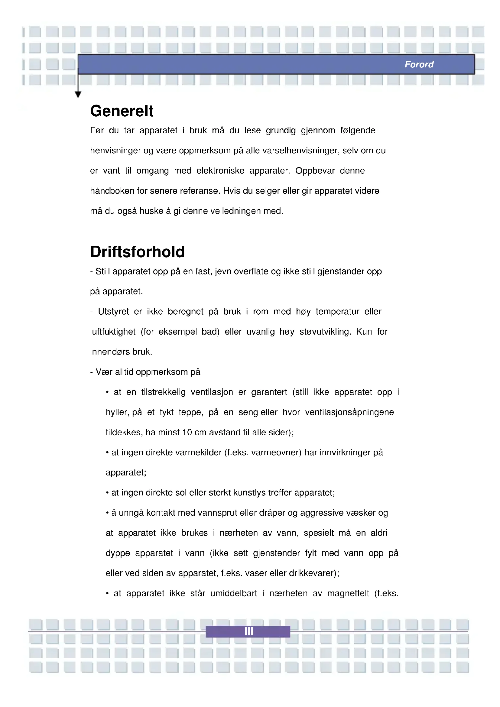 Før du tar apparatet i bruk må du lese grundig gjennom følgende henvisninger og være oppmerksom på alle varselhenvisninger, selv om du er vant til omgang med elektroniske apparater. Oppbevar denne håndboken for senere referanse. Hvis du selger eller gir apparatet videre må du også huske å gi denne veiledningen med.
