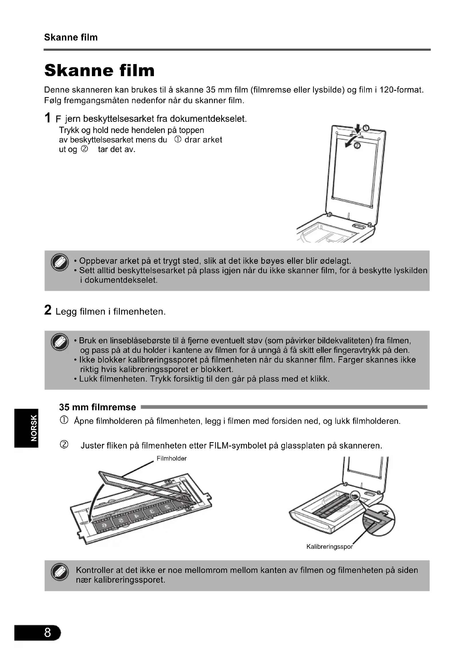- Oppbevar arket på et trygt sted, slik at det ikke bøyes eller blir ødelagt.• Sett alltid beskyttelsesarket på plass igjen når du ikke skanner film, for å beskytte lyskilden i dokumentdekselet.• Bruk en linseblåsebørste til å fjerne eventuelt støv (som påvirker bildekvaliteten) fra filmen, og pass på at du holder i kantene av filmen for å unngå å få skitt eller fingeravtrykk på den.• Ikke blokker kalibreringssporet på filmenheten når du skanner film. Farger skannes ikke riktig hvis kalibreringssporet er blokkert.• Lukk filmenheten. Trykk forsiktig til den går på plass med et klikk.Kontroller at det ikke er noe mellomrom mellom kanten av filmen og filmenheten på siden nær kalibreringssporet.FilmholderKalibreringssporSkanne film