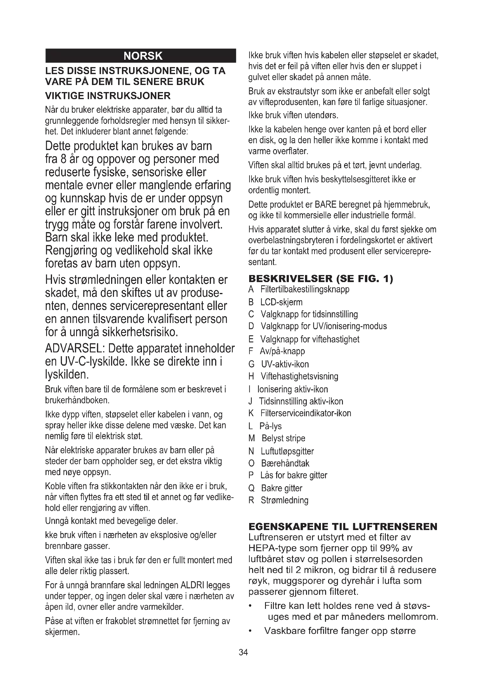 VIKTIGE INSTRUKSJONER Når du bruker elektriske apparater, bør du alltid ta grunnleggende forholdsregler med hensyn til sikker- het. Det inkluderer blant annet følgende: Dette produktet kan brukes av barn fra 8 år og oppover og personer med reduserte fysiske, sensoriske eller mentale evner eller manglende erfaring og kunnskap hvis de er under oppsyn eller er gitt instruksjoner om bruk på en trygg måte og forstår farene involvert. Barn skal ikke leke med produktet. Rengjøring og vedlikehold skal ikke foretas av barn uten oppsyn. Hvis strømledningen eller kontakten er skadet, må den skiftes ut av produse- nten, dennes servicerepresentant eller en annen tilsvarende kvalisert person for å unngå sikkerhetsrisiko. ADVARSEL: Dette apparatet inneholder en UV-C-lyskilde. Ikke se direkte inn i lyskilden. Bruk viften bare til de formålene som er beskrevet i brukerhåndboken. Ikke dypp viften, støpselet eller kabelen i vann, og spray heller ikke disse delene med væske. Det kan nemlig føre til elektrisk støt. Når elektriske apparater brukes av barn eller på steder der barn oppholder seg, er det ekstra viktig med nøye oppsyn. Koble viften fra stikkontakten når den ikke er i bruk, når viften yttes fra ett sted til et annet og før vedlike- hold eller rengjøring av viften. Unngå kontakt med bevegelige deler. kke bruk viften i nærheten av eksplosive og/eller brennbare gasser. Viften skal ikke tas i bruk før den er fullt montert med alle deler riktig plassert. For å unngå brannfare skal ledningen ALDRI legges under tepper, og ingen deler skal være i nærheten av åpen ild, ovner eller andre varmekilder. Påse at viften er frakoblet strømnettet før fjerning av skjermen. Ikke bruk viften hvis kabelen eller støpselet er skadet, hvis det er feil på viften eller hvis den er sluppet i gulvet eller skadet på annen måte. Bruk av ekstrautstyr som ikke er anbefalt eller solgt av vifteprodusenten, kan føre til farlige situasjoner. Ikke bruk viften utendørs. Ikke la kabelen henge over kanten på et bord eller en disk, og la den heller ikke komme i kontakt med varme overater. Viften skal alltid brukes på et tørt, jevnt underlag. Ikke bruk viften hvis beskyttelsesgitteret ikke er ordentlig montert. Dette produktet er BARE beregnet på hjemmebruk, og ikke til kommersielle eller industrielle formål. Hvis apparatet slutter å virke, skal du først sjekke om overbelastningsbryteren i fordelingskortet er aktivert før du tar kontakt med produsent eller servicerepre- sentant. BESKRIVELSER (SE FIG. 1) A Filtertilbakestillingsknapp B LCD-skjerm C Valgknapp for tidsinnstilling D Valgknapp for UV/ionisering-modus E Valgknapp for viftehastighet F Av/på-knapp G UV-aktiv-ikon H Viftehastighetsvisning I Ionisering aktiv-ikon J Tidsinnstilling aktiv-ikon K Filterserviceindikator-ikon L På-lys M Belyst stripe N Luftutløpsgitter O Bærehåndtak P Lås for bakre gitter Q Bakre gitter R Strømledning