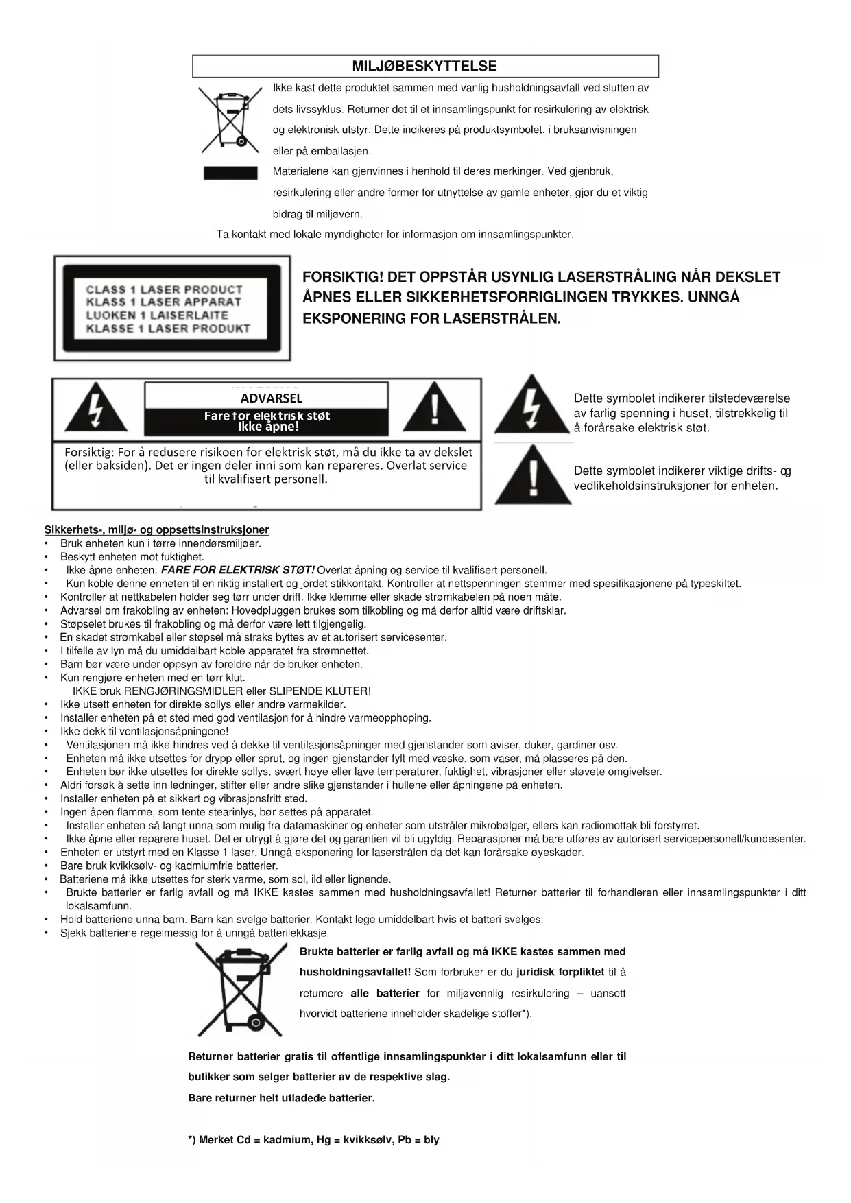 - Sjekk batteriene regelmessig for å unngå batterilekkasje. Brukte batterier er farlig avfall og må IKKE kastes sammen med husholdningsavfallet! Som forbruker er du juridisk forpliktet til å returnere alle batterier for miljøvennlig resirkulering – uansett hvorvidt batteriene inneholder skadelige stoffer*). Returner batterier gratis til offentlige innsamlingspunkter i ditt lokalsamfunn eller til butikker som selger batterier av de respektive slag. Bare returner helt utladede batterier. *) Merket Cd = kadmium, Hg = kvikksølv, Pb = bly sZ^>