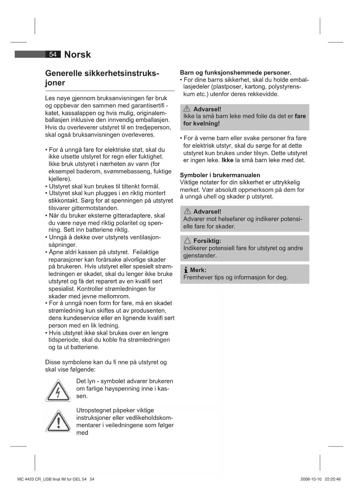 - Lukk batteriseksjonen. Hvis apparatet ikke skal bruker over et lengre tidsrom, fjern batteriene fra apparatet for å unngå lekkasje av batterisyre. Forsiktig: Batterier skal ikke kastes i husholdningsavfall- et. Vennligst ta tomme batterier til et oppsam- lingssted eller lever det tilbake til en forhan- dler. Norsk MC 4420 CR_USB final IM for GEL 55 55MC 4420 CR_USB final IM for GEL 55 55 2008-10-10 22:20:482008-10-10 22:20:4856 Advarsel: