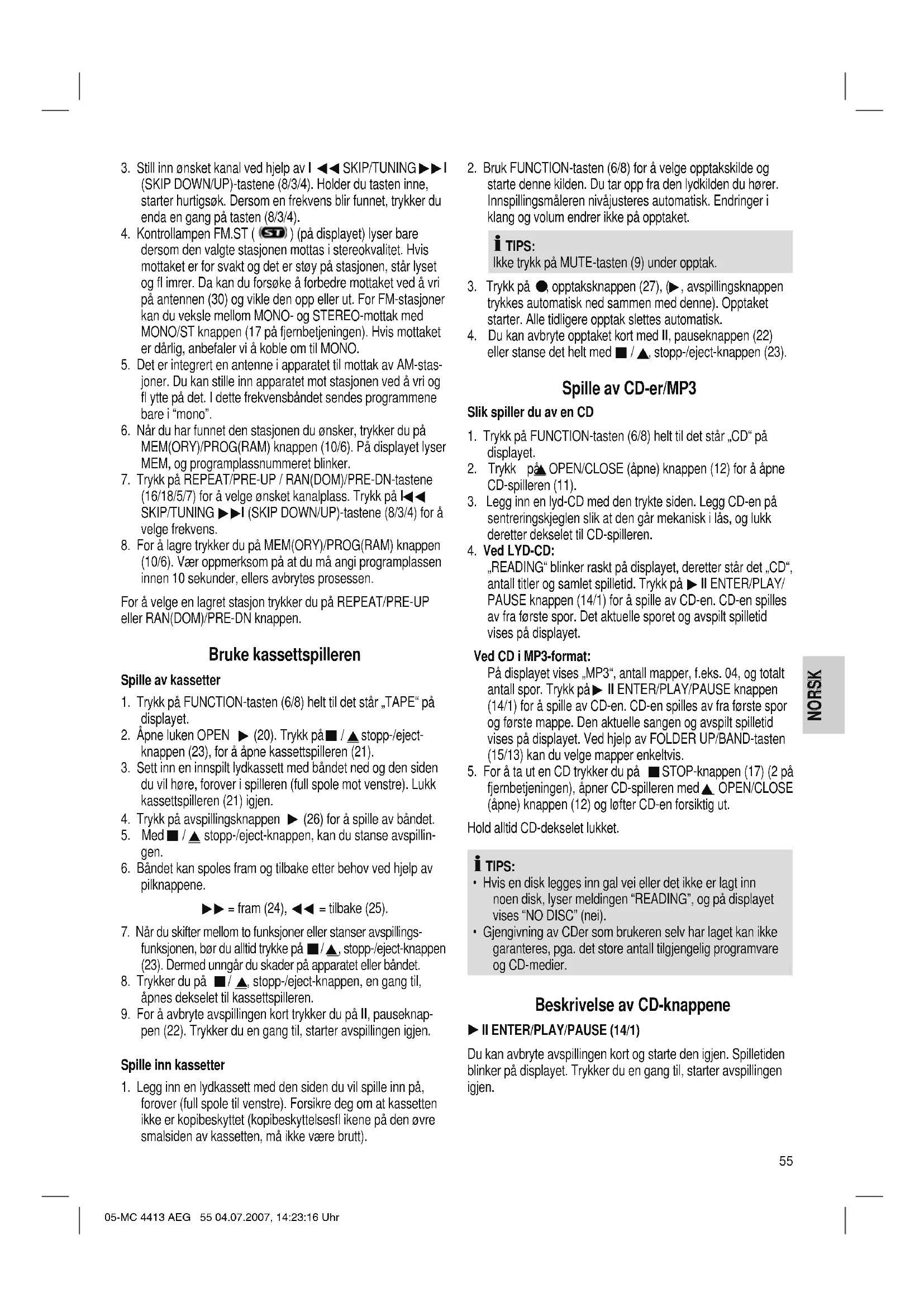 STOP knappen. 05-MC 4413 AEG 57 04.07.2007, 14:23:20 Uhr58 NORSK NORSK Apparatet stopper automatisk etter at alle programmerte spor er spilt av. ndikatoren PROG slukkes. Den programmerte rekkefølgen beholdes i minnet til du bytter til en annen modus, CD-en tas ut av CD-skuffen eller apparatet blir slått av eller satt i standby-modus. Du kan også kombinere de programmerte sporene med REPEAT-funksjonen. Etter at du har programmert og har startet apparatet, trykker du inntil 3 x på REPEAT/PRE-UP-knappen (16/5). Funksjonene kan brukes slik det er beskrevet under avsnittet “REPEAT”. Avspilling av musikk i MP3-format Med dette apparatet kan du spille av musikkstykker i MP3- format. Apparatet støtter dessuten de alminnelige CD-typene: CD, CD-RW, CD-R. Med dette apparatet kan du spille av MP3-CD-er. På slike CD-er kan inntil 200 spor lagres komprimert. Apparatet gjenkjenner en MP3-CD automatisk (på displayet vises totalt antall spor MP3). For å spille av disse CD-ene går du fram slik det er beskrevet for avspilling av CD-er/MP3. Du kan programmere spor på samme måte som det er beskrevet under “Programmert avspilling”. NB! Det fi nnes mange brenne- og komprimeringsmetoder, og det er kvalitetsforskjell på ferdigkjøpte CD-er og brente CD-er. I tillegg følger ikke musikkindustrien noen fast standard (kopisperre). Derfor kan det i sjeldne tilfeller oppstå problemer ved avspilling av CD-er og MP3-disker. Dette skyldes ikke feil på apparatet. Rengjøring og vedlikehold