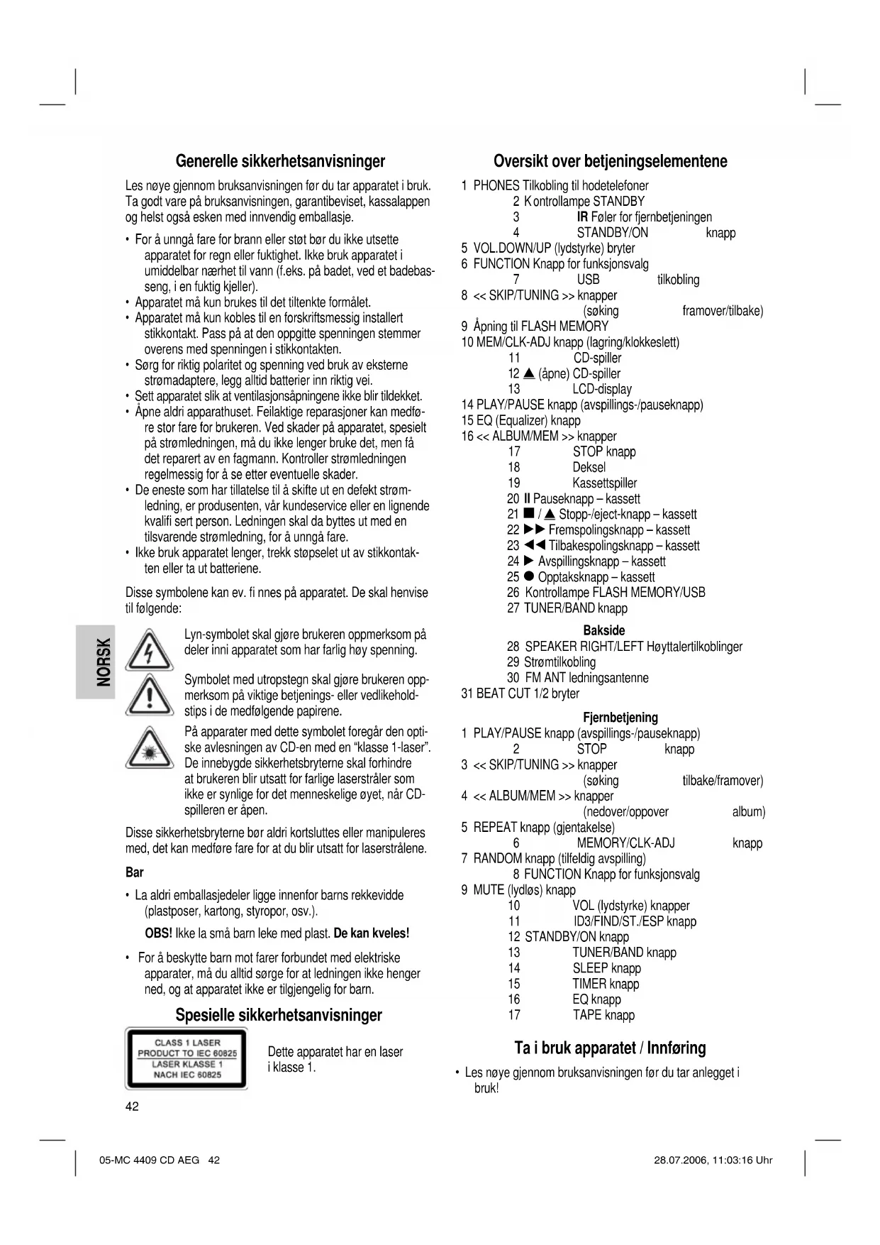 - Ikke bruk apparatet lenger, trekk støpselet ut av stikkontak- ten eller ta ut batteriene. Disse symbolene kan ev. fi nnes på apparatet. De skal henvise til følgende: Lyn-symbolet skal gjøre brukeren oppmerksom på deler inni apparatet som har farlig høy spenning. Symbolet med utropstegn skal gjøre brukeren opp- merksom på viktige betjenings- eller vedlikehold- stips i de medfølgende papirene. På apparater med dette symbolet foregår den opti- ske avlesningen av CD-en med en “klasse 1-laser”. De innebygde sikkerhetsbryterne skal forhindre at brukeren blir utsatt for farlige laserstråler som ikke er synlige for det menneskelige øyet, når CD- spilleren er åpen. Disse sikkerhetsbryterne bør aldri kortsluttes eller manipuleres med, det kan medføre fare for at du blir utsatt for laserstrålene. Bar