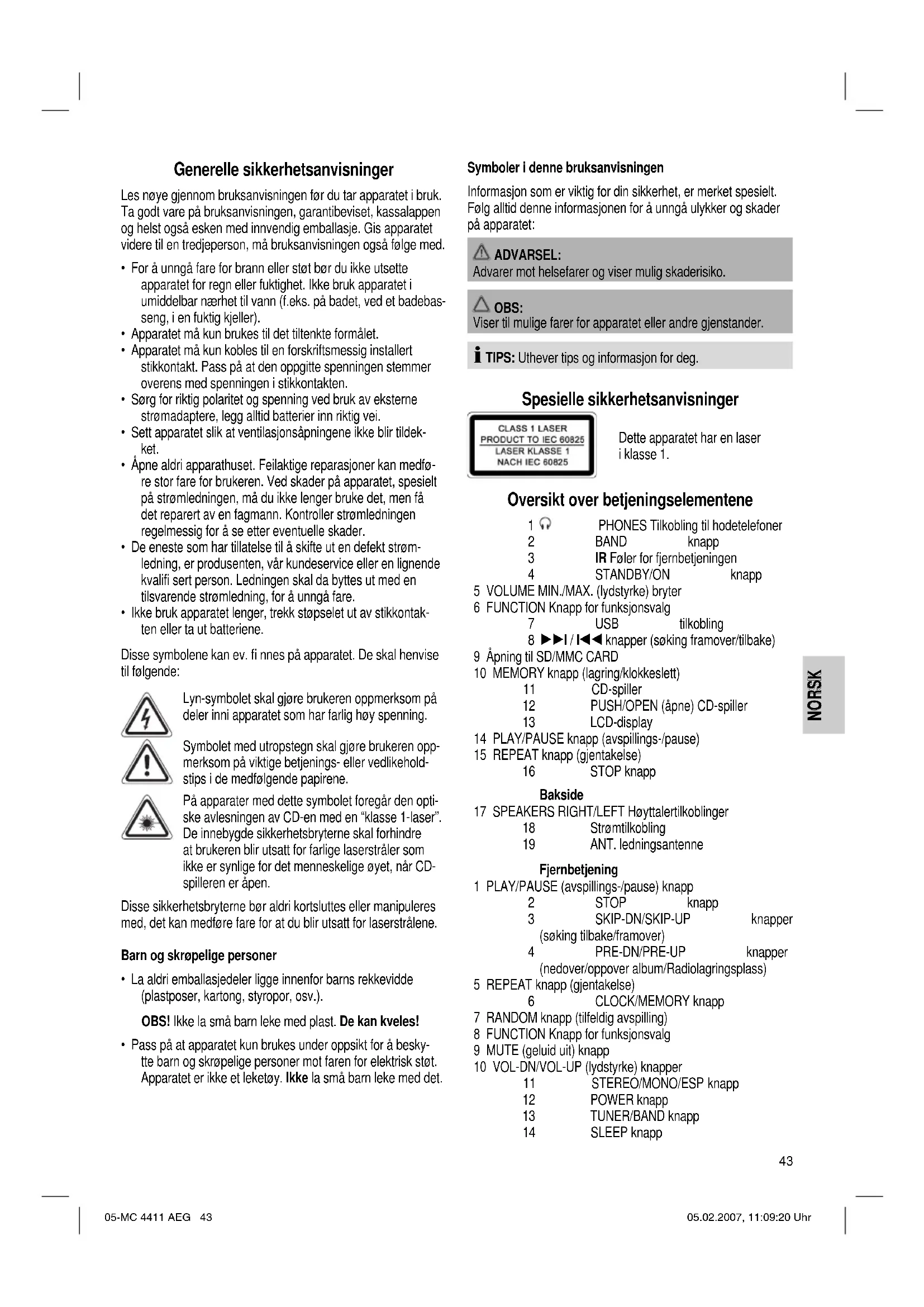 - Ikke bruk apparatet lenger, trekk støpselet ut av stikkontak- ten eller ta ut batteriene. Disse symbolene kan ev. fi nnes på apparatet. De skal henvise til følgende: Lyn-symbolet skal gjøre brukeren oppmerksom på deler inni apparatet som har farlig høy spenning. Symbolet med utropstegn skal gjøre brukeren opp- merksom på viktige betjenings- eller vedlikehold- stips i de medfølgende papirene. På apparater med dette symbolet foregår den opti- ske avlesningen av CD-en med en “klasse 1-laser”. De innebygde sikkerhetsbryterne skal forhindre at brukeren blir utsatt for farlige laserstråler som ikke er synlige for det menneskelige øyet, når CD- spilleren er åpen. Disse sikkerhetsbryterne bør aldri kortsluttes eller manipuleres med, det kan medføre fare for at du blir utsatt for laserstrålene. Barn og skrøpelige personer