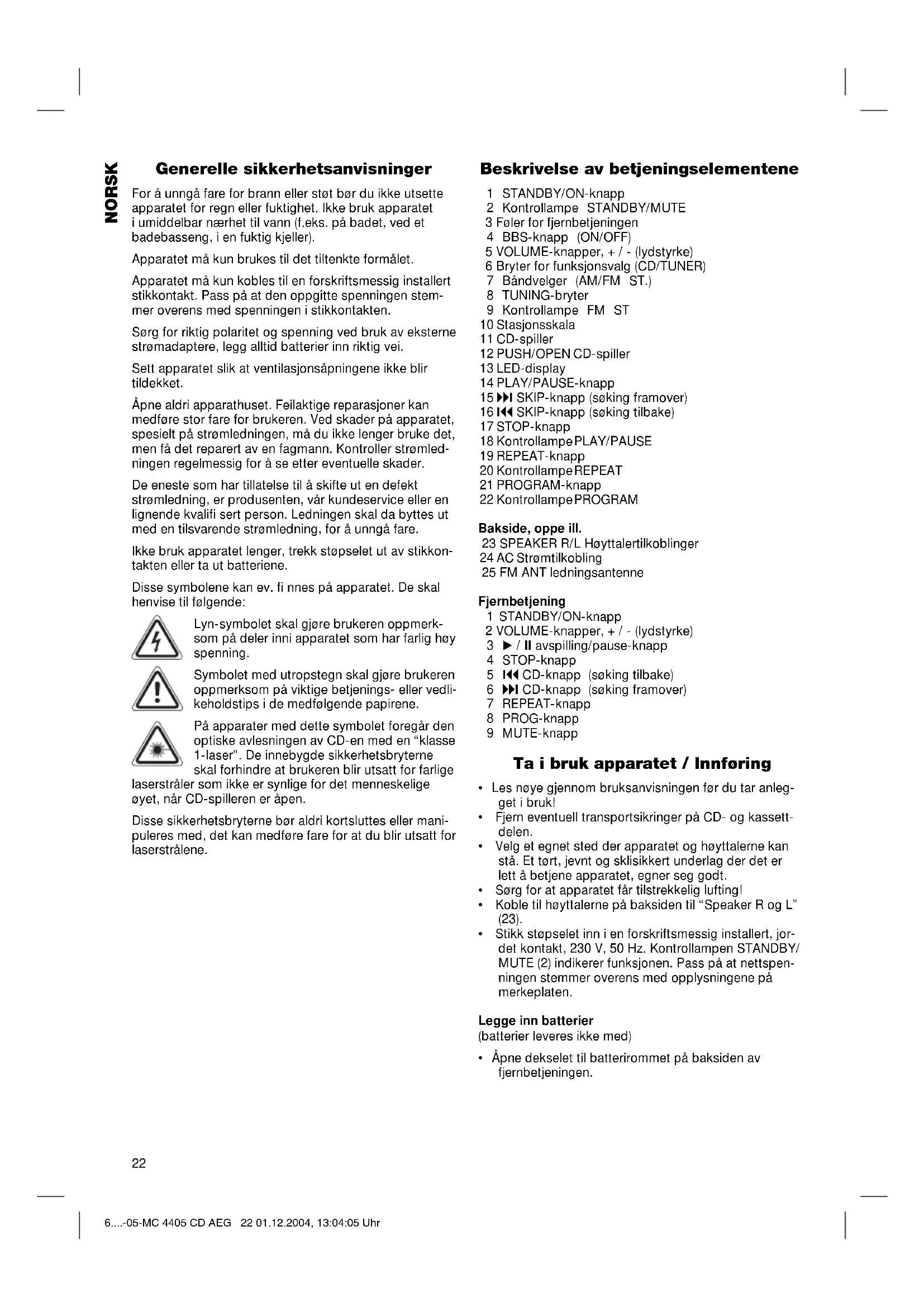 Last ned instruksjonene for din Hifi-system i PDF-format gratis! Finn veiledningen din MC 4405 CD - AEG og ta den elektroniske enheten tilbake i hendene. På denne siden er alle dokumenter som er nødvendige for bruken av enheten din publisert. MC 4405 CD av merket AEG.