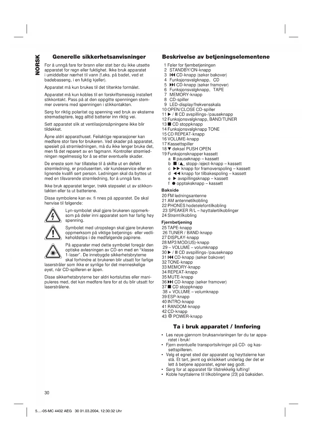 ses avspillingen, og programmet slettes. Du kan kombinere de programmerte sporene med RE- PEAT-funksjonen. Etter at du har programmert og startet apparatet, trykker du opptil 3 ganger på REPEAT-knap- pen og funksjonene kan brukes slik det er beskrevet i avsnittet “REPEAT”. Beskrivelse av CD-knappene på fjernbetjeningen TAPE (25): Kobler over til TAPE-modus (kassett- delen). TUNER/ BAND (26): Kobler over til radiomodus. DISPLAY (27): 1 x trykk når en CD er på (ikke i MP3- modus): Den totale spilletiden for sporet telles baklengs. 2 x trykk: Den totale spilletiden for hele CD-en telles baklengs. 3 x trykk: Den aktuelle sangen og den spilletiden som har gått, vises i displayet. 5....-05-MC 4402 AEG 32 01.03.2004, 12:30:34 Uhr33 NORSK MP3 MOD (28): Kobler over til MP3-modus. / II (30): Starter CD-en. Du kan avbryte avspillingen kort: Trykk en gang til på PLAY-knappen. Indikatoren i displayet blinker. I / I (31/36): Med disse knappene kan du hoppe til neste spor eller sporet etter det igjen osv. Hvis du holder knappen inne, begynner et sporsøk. TONE (32): Se punktet “TONE”. MEMORY (33): Se punktet “Programmert avspilling”. REPEAT (34): Se punktet “REPEAT”. MUTE (35): Senker volumet raskt. For å oppheve denne funksjonen trykker du på MUTE-knappen en gang til. stopp (37): CD-en stanses. I displayet blinker ordet “MUTE”. ESP (39): Deaktiverer/ aktiverer anti-sjokkfunks- jonen når det er lagt inn en lyd-CD (ikke i MP3-modus). Trykk på STOP, trykk inntil 2 ganger på ESP-knappen. I displayet vises ESP ON eller OFF. Ved feil leses CD-musikkdataene ut av et mellomlager. Dette skjer helt problemfritt. Avlesingsfeil korrigeres senere i mellomlageret. INTRO (40): Spiller ca. 10 sekunder av sangene på CD-en og hopper så til neste spor (ikke i MP3-modus). RANDOM (41): Hvis du trykker på RANDOM-knappen, spilles alle sporene av i en tilfeldig rekkefølge (ikke i MP3-modus). Indika- toren RANDOM i displayet angir denne funksjonen. Trykker du på knappen en gang til, oppheves alle funksjonene, og apparatet spiller videre i normal avspillingsmodus. CD (42): Kobler over til CD-modus. Spesialfunksjoner MP3-CD-er Med dette apparatet kan du også spille av MP3- CD-er. På slike plater kan opptil 200 spor lagres komprimert. Apparatet gjenkjenner en MP3-CD automatisk (i displayet vises MP3). Dermed op- prettholdes klangkvaliteten. For å spille av disse CD-ene går du fram på samme måte som beskrevet for vanlige CD-er. Dette apparatet har blitt testet i henhold til alle aktuelle CE-retningslinjer som det rammes av, f.eks. elektro- magnetisk toleranse og direktiver om lavspenning. Det er laget i henhold til dagens nyeste sikkerhetstekniske forskrifter. Med forbehold om tekniske endringer! Garanti For apparat som vi har solgt, påtar vi oss en garanti på 24 måneder fra kjøpsdato (kassalapp). Innenfor garantitiden fjerner vi mangler på apparat eller tilbehør*) uten omkostninger hvis manglene skyldes ma- terial- eller produksjonsfeil. Dette gjør vi ved reparasjon eller – etter vår vurdering – bytting. Garantiytelser medfører ingen forlengelse av garantiti- den, og det oppstår heller ikke noe krav på en ny garanti på grunn av dette! Som garantibevis gjelder kjøpsbeviset. Uten dette bevi- set kan du ikke få byttet eller reparert apparatet gratis. I forbindelse med garanti ber vi om at du gir hele appa- ratet i originalemballasjen sammen med kassalappen til din forhandler. *) Skader på tilbehørsdeler fører ikke automatisk til at du får byttet hele apparatet gratis. I slike tilfeller ber vi deg om å henvende deg til vår hotline! Glasskader eller sprekker i plastdeler er i prinsippet kostnadspliktige! Verken defekter på forbrukstilbehør og slitasjedeler (for eksempel motorkull, eltekroker, drivremmer, ekstra fjernbetjening, ekstra tannbørster, sagblader osv.) eller rengjøring, vedlikehold og utskifting av slitasjedeler går inn under garantien. Slike ting er derfor kostnadspliktige! Garantien utgår ved inngrep utenfra. Etter garantien Etter at garantitiden har gått ut, kan reparasjoner utføres av den aktuelle faghandelen eller reparasjonsservice mot betaling. 5....-05-MC 4402 AEG 33 01.03.2004, 12:30:34 UhrENGLISH